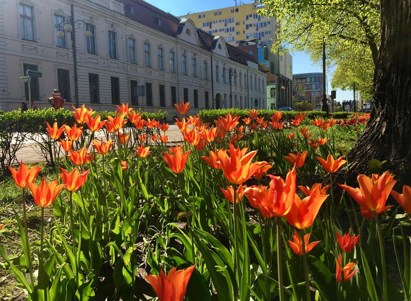 Dawna aleja kwiatowa zwykle bywa opustoszała, bo jej betonowa szarość jest odpychająca. Ale teraz nawet w tę popękaną monochromatyczną przestrzeń wreszcie wdarł się kolor. Warto więc zajrzeć w to miejsce, niegdyś tętniące życiem kwiatowego corso, aby przekonać się, że i tu wiosna intensywnie rozkwita. Setkami tulipanów, nasadzonymi zgodnie z wzorcem zaczerpniętym z holenderskich ogrodów królewskich. Naprawdę, jest czym wzrok nasycić.
