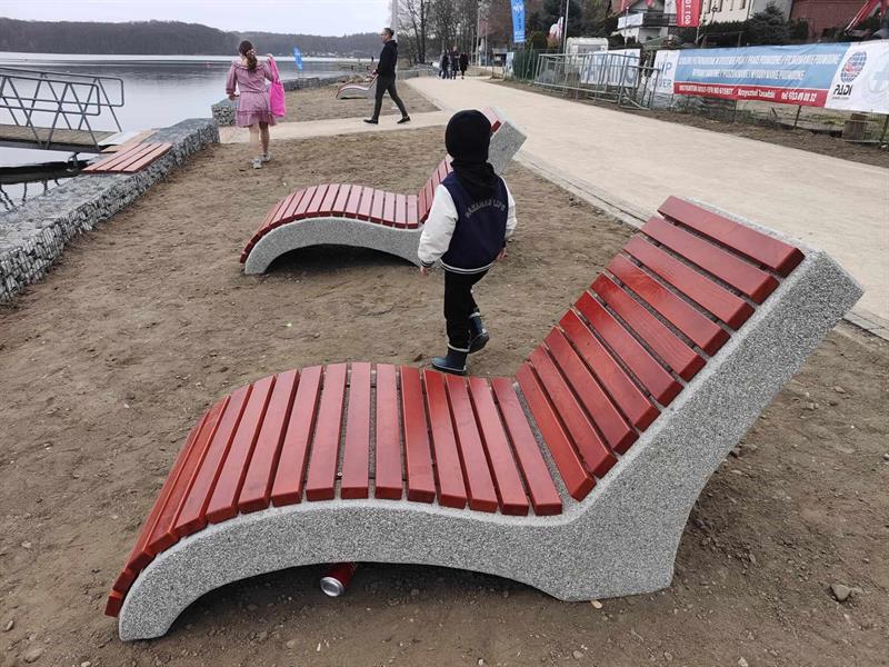 Wzdłuż deptaka zamontowano betonowo-drewniane leżanki. Fot. Wioletta MORDASIEWICZ