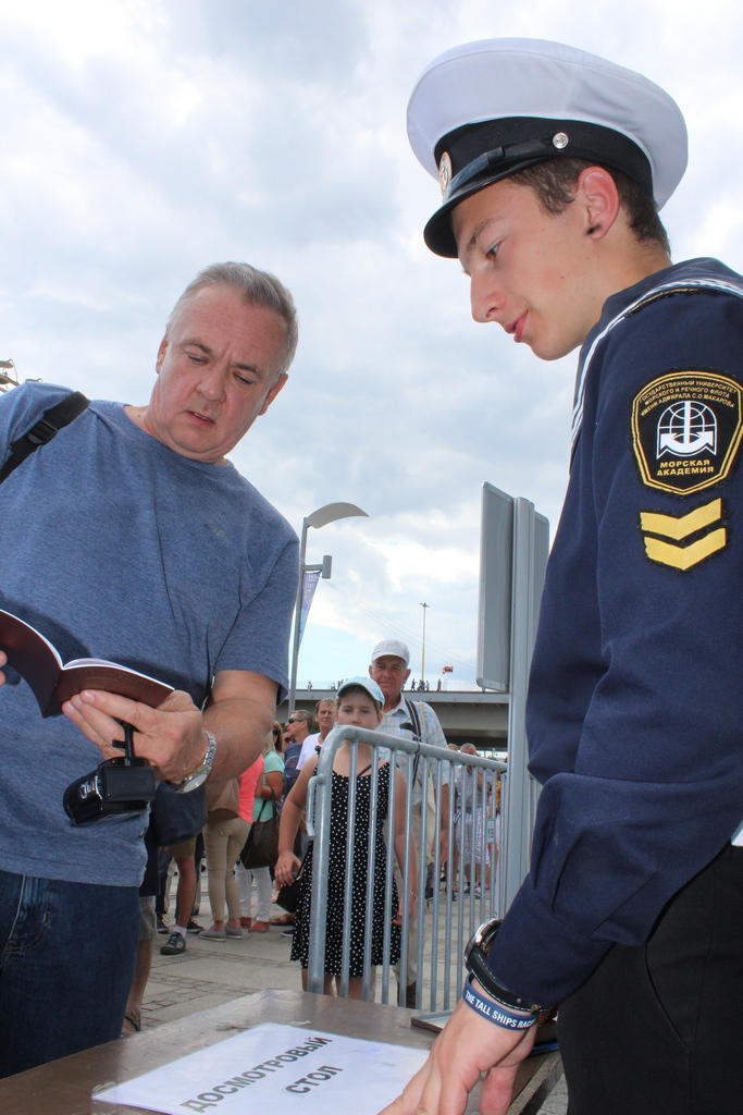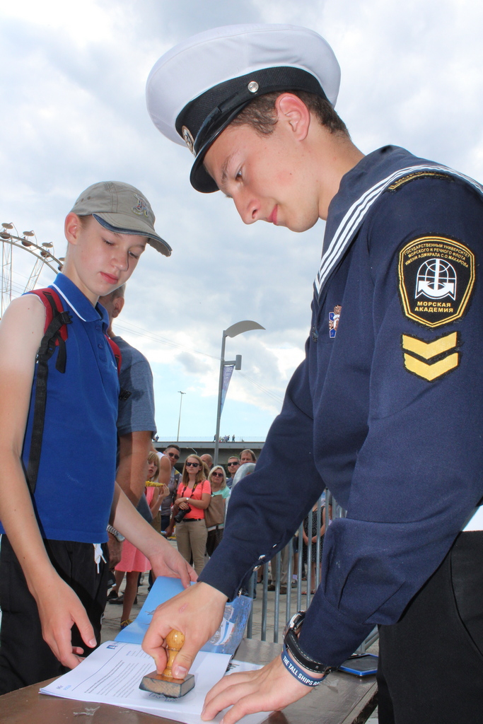 Ograniczeń nie ma natomiast marynarz, który z uśmiechem, bez przerwy, wszystkim chętnym przystawia pieczątki - w zeszycie, na plakacie, czy nawet przedramieniu.