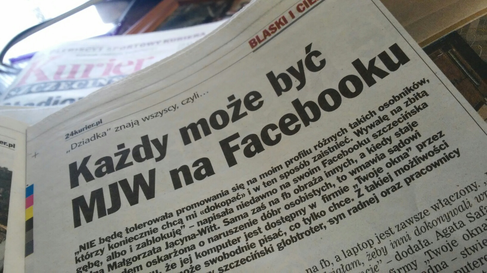 W ubiegłym roku Jacyna-Witt zamieściła, w okresie od 15 września do 8 października, cztery informacje o tym, że prokurator wszczął śledztwo w stosunku do dyrektora Zarządu Budynków i Lokali Komunalnych w Szczecinie Marcina Posadzego oraz, że przedstawił mu zarzuty niegospodarności. To ostanie nie było prawdą. Ba, kiedy jeden z jej rozmówców, napisał, że nikt dyrektorowi nie postawił zarzutów i poradził radnej, by czytała treść pisma prokuratora ze zrozumieniem, to Jacyna odpisała mu „by się ogarnął”. Radna brnęła dalej - krytykowała media, że jej nie sprzyjają i bronią dyrektora. Przypomnijmy - prokurator żadnych zarzutów dyrektorowi nie postawił. Jednak radna najwidoczniej nie odróżnia pojęć postawienie zarzutów i śledztwo w sprawie i dalej upierała się przy swoim. Podobnie jak jej 37-letni syn, co się okazało już podczas rozprawy sądowej.