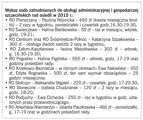 Chociaż członkowie szczecińskich Rad Osiedli swe funkcje - co do zasady - pełnią społecznie, to też przyznają sobie diety. I chociaż to na nich ciąży statutowy obowiązek i wyłączne prawo do korzystania oraz zarządzania siedzibą RO, to jeszcze w ubiegłym roku Biuro Rady Miasta dla 11 z 37 osiedlowych samorządów zatrudniało dodatkową obsługę administracyjną i gospodarczą. Jak będzie w tym roku?