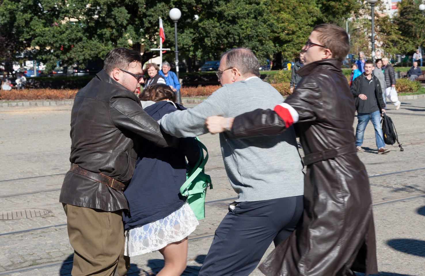 Na zdjęciu: Inscenizacja zatrzymania w stanie wojennym - pl. Grunwaldzki w Szczecinie