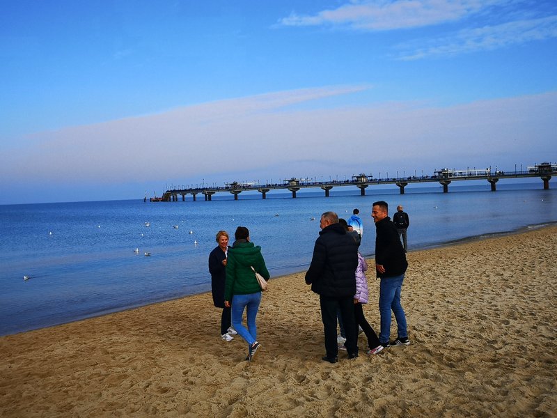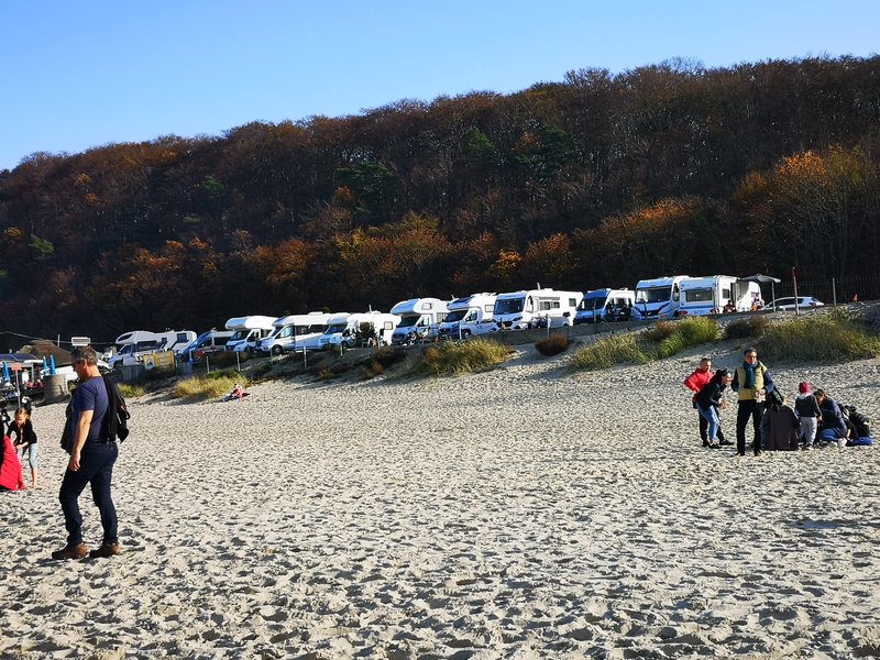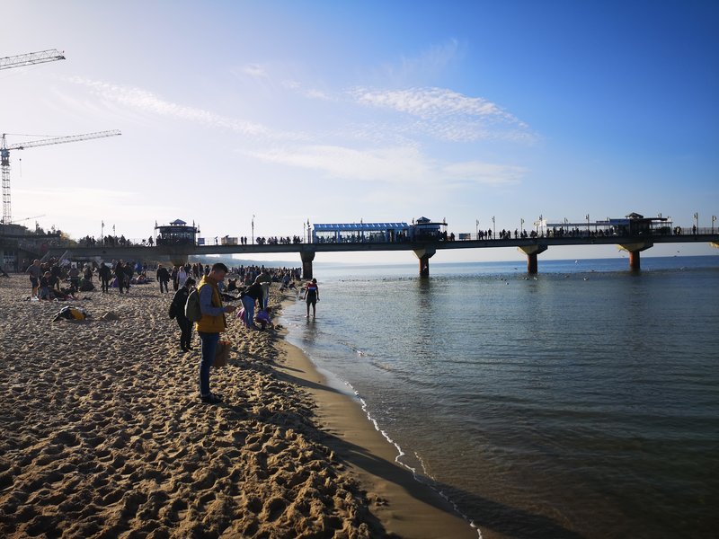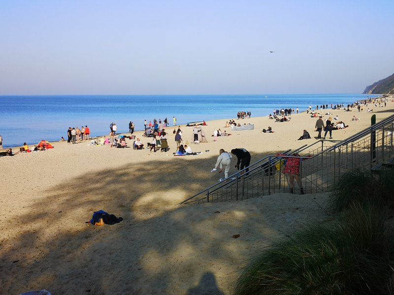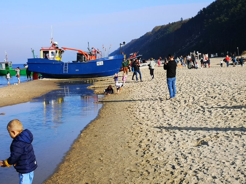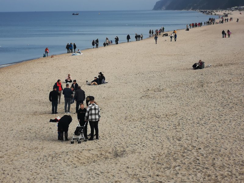 Na plaży królowała moda… całoroczna. Byli odważni, którzy się kąpali w morzu, było wielu opalających się, spacerujących w krótkich rękawach, ale także w… zimowych kurtkach. Widziałem także trzyletnie dziecko w zimowej czapce z pomponem i grubej kurtce.