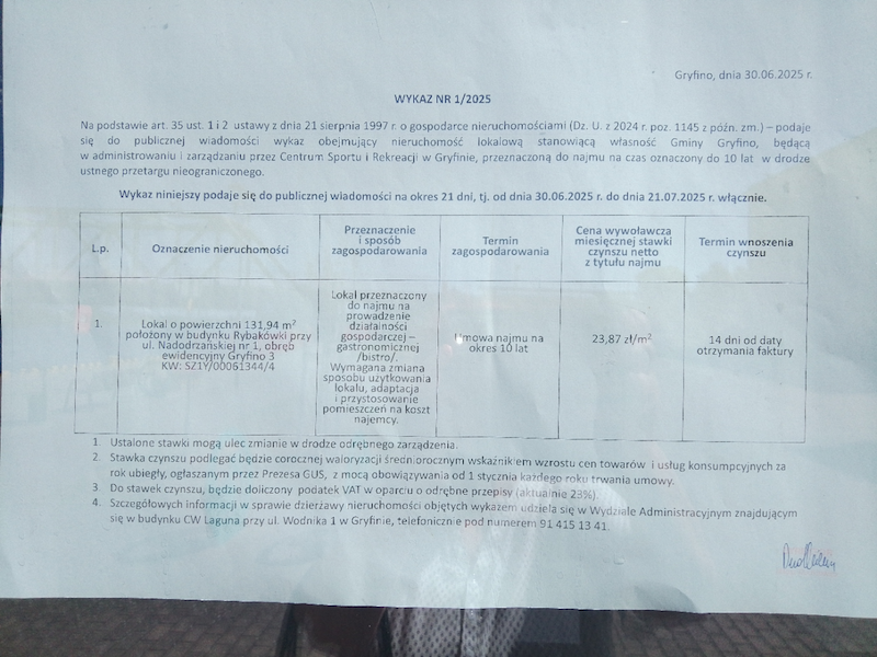 W lokalu ma być prowadzona działalność gospodarcza – gastronomiczna (bistro). Od przyszłego najemcy wymagana jest – na jego koszt – zmiana sposobu użytkowania lokalu oraz adaptacja i przystosowanie pomieszczeń do nowej funkcji. Wykaz podano do publicznej wiadomości na okres 21 dni, tj. do 21 lipca br.