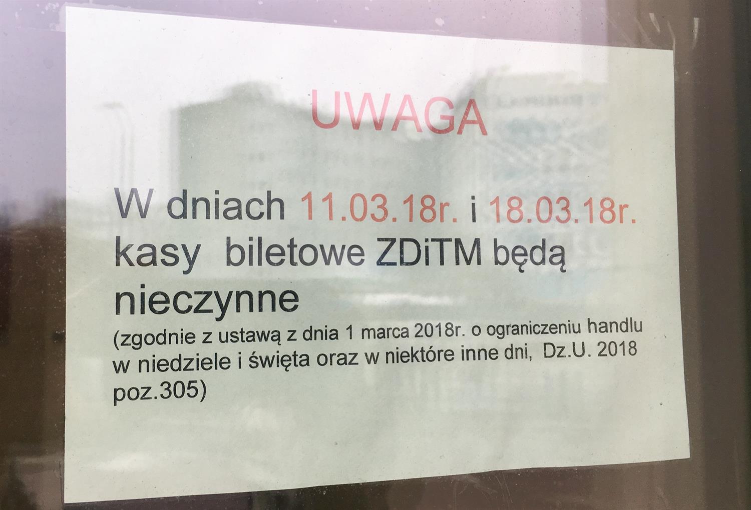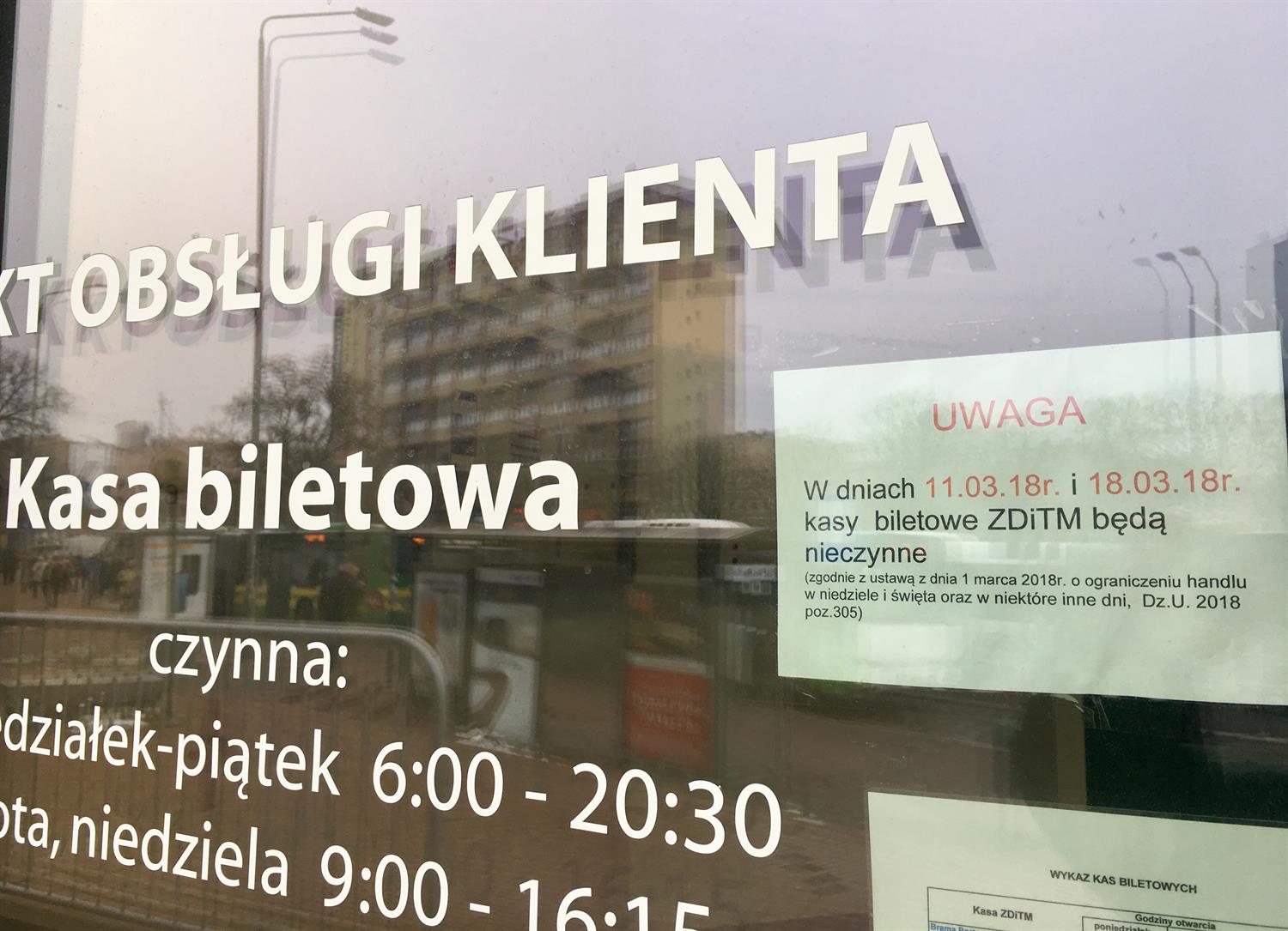 W kasach biletowych szczecińskiego ZDiTM pojawiły się komunikaty o ich zamknięciu w dniach 11 i 18 marca. Dotyczy to kas przy pl. Rodła, na pętli Turkusowa i w CH Turzyn przy al. Bohaterów Warszawy 40. Opatrzone są adnotacją, że to zgodnie z ustawą z... 1 marca 2018 r. o ograniczeniu handlu w niedziele i święta oraz w inne dni. Choć ustawa uchwalona została 10 stycznia tego roku.