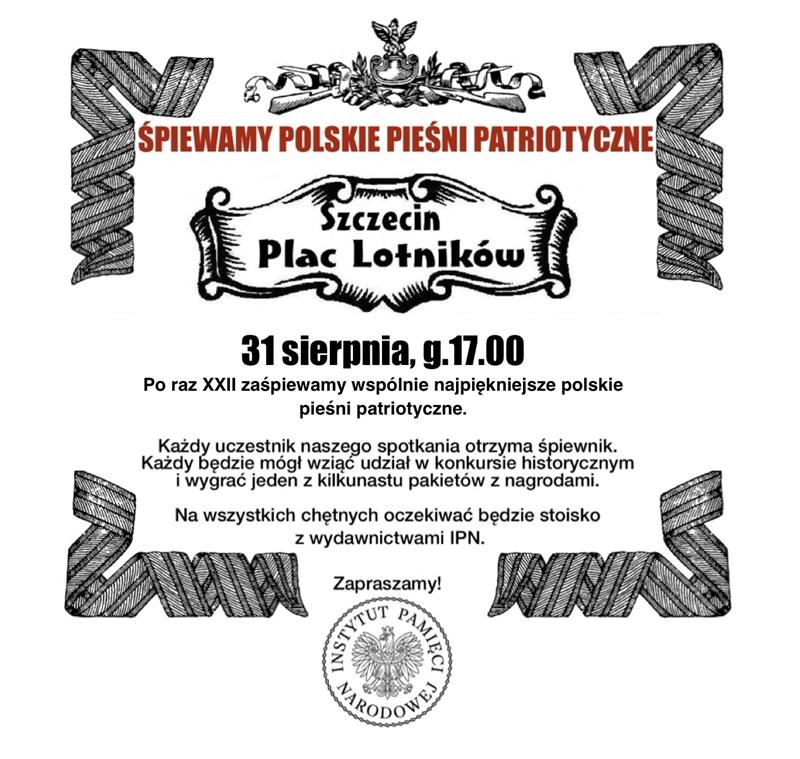 W niedzielę o g. 17 na placu Lotników w Szczecinie rozpocznie się wielkie śpiewanie pieśni patriotycznych. Już po raz dwudziesty drugi tę imprezę organizuje Leszek Dobrzyński, polityk Prawa i Sprawiedliwości, obecnie radny sejmikowy. W niedzielne wydarzenie zaangażował się też szczeciński oddział Instytutu Pamięci Narodowej.