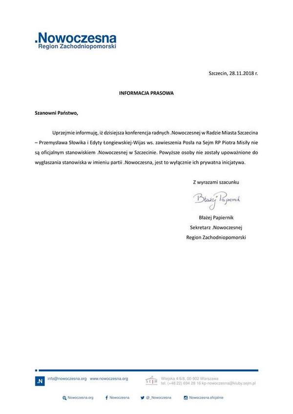 Papernik rozesłał do mediów pismo o takiej treści: „Uprzejmie informuję, iż dzisiejsza konferencja radnych .Nowoczesnej w Radzie Miasta Szczecina – Przemysława Słowika i Edyty Łongiewskiej - Wijas ws. zawieszenia Posła na Sejm RP Piotra Misiły nie są oficjalnym stanowiskiem .Nowoczesnej w Szczecinie. Powyższe osoby nie zostały upoważnione do wygłaszania stanowiska w imieniu partii .Nowoczesna, jest to wyłącznie ich prywatna inicjatywa .”