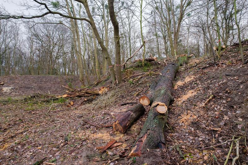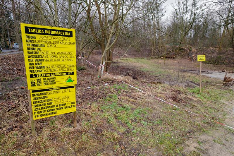 Pojawiła się tablica zakazująca wstępu. Od pił padają kolejne drzewa. Tak w Podjuchach rozpoczęła się realizacja kolejnego z tzw. zielonych projektów Szczecińskiego Budżetu Obywatelskiego, czyli budowa skateparku w technologii betonowo-monolitycznej.