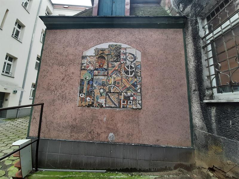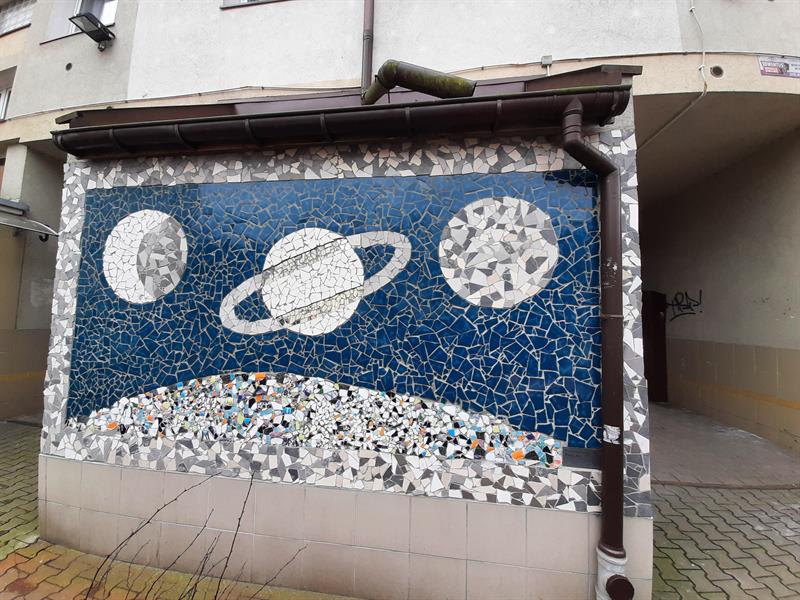 I rzeczywiście. Na początek - najstarsza, powojenna, bardzo duża praca mozaikowa - na kinie Kosmos. Kawałek dalej - nowa mozaika Stowarzyszenia Oswajanie Sztuki i Kolektywu Dobre Praktyki... Później mozaiki w kolejnych podwórkach, sklepach, restauracjach, a nawet na chodniku (deptak Bogusława). Każda z własną historią, niektóre z tajemnicą...