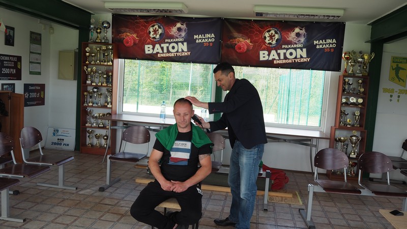 Sam nowy prezes Zachodniopomorskiego Związku Piłki Nożnej, Maciej Mateńko, strzygł chętne osoby za datki do charytatywnej skarbonki.