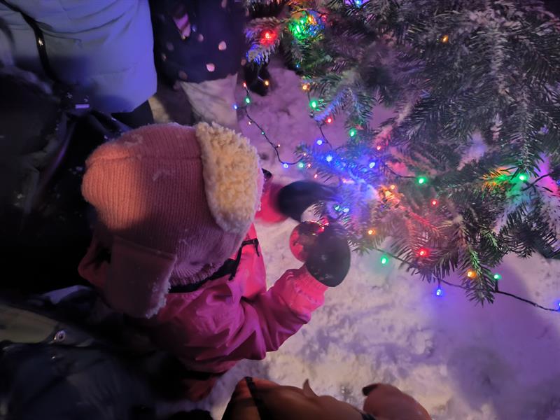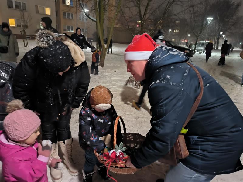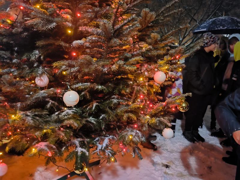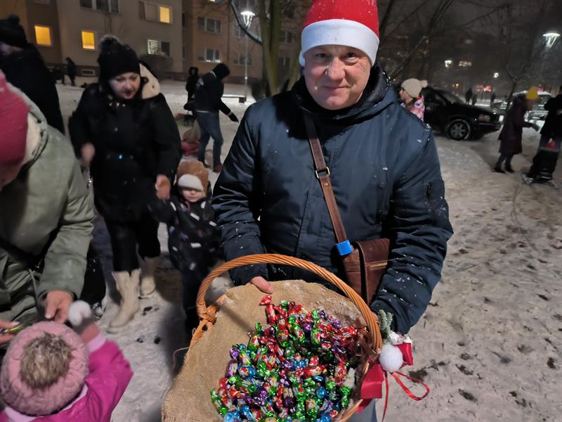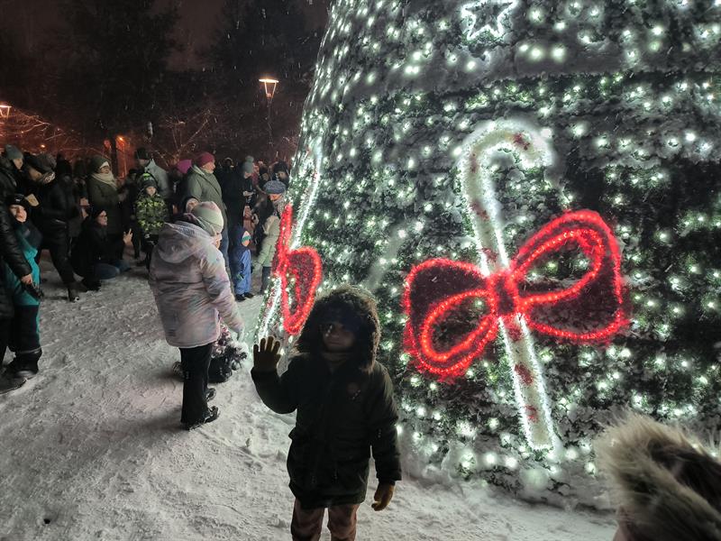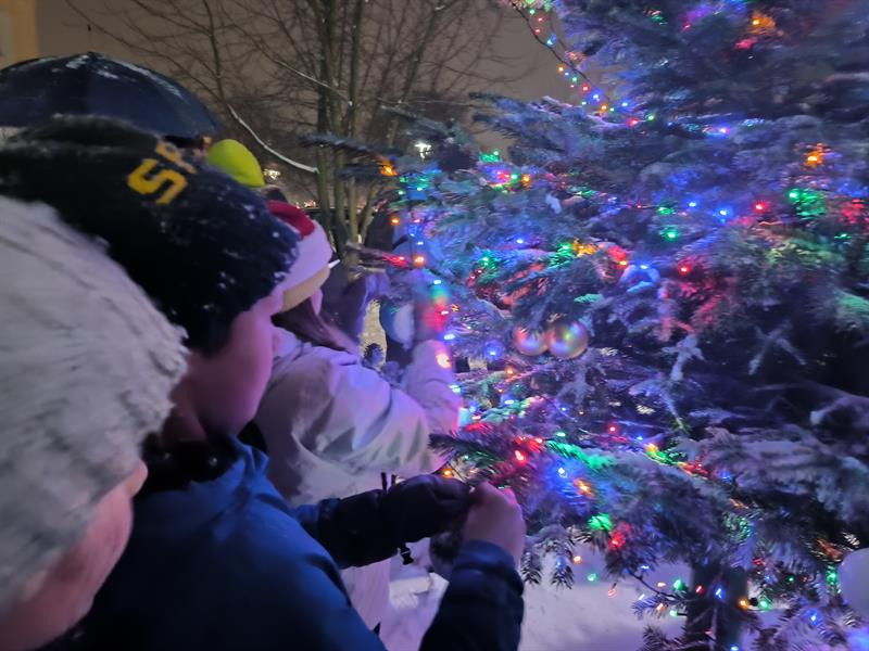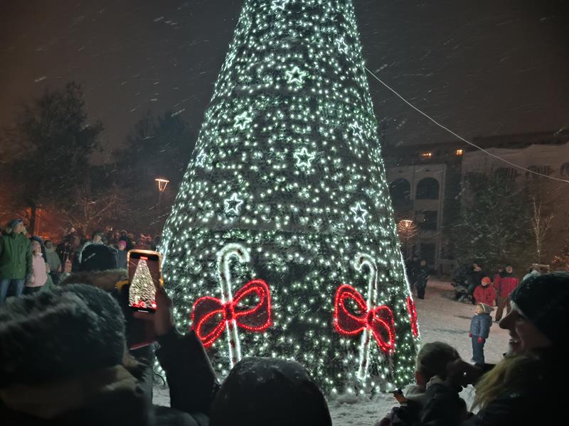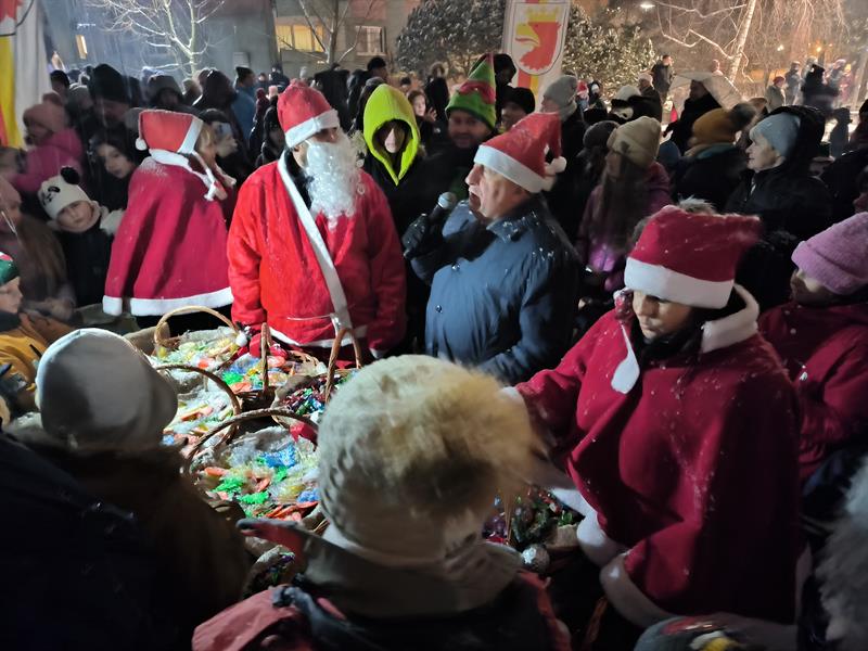Duże, świąteczne drzewko stanęło na deptaku im. Ryszarda Tokarczyka. A właśnie w środę 6 grudnia wokół niego przechadzał się mikołaj w towarzystwie gminnych włodarzy. Chodzili z koszami pełnymi cukierków i bombek. Bombki można było własnoręcznie podpisać lub ozdobić i powiesić na żywej choince. Wielu tak właśnie robiło. Atmosfera była prawdziwie świąteczna - padał śnieg, a otoczenie rozświetlały nie tylko lampki na choince, ale też żywe płomienie tlące się w rozstawionych specjalnych koszach.