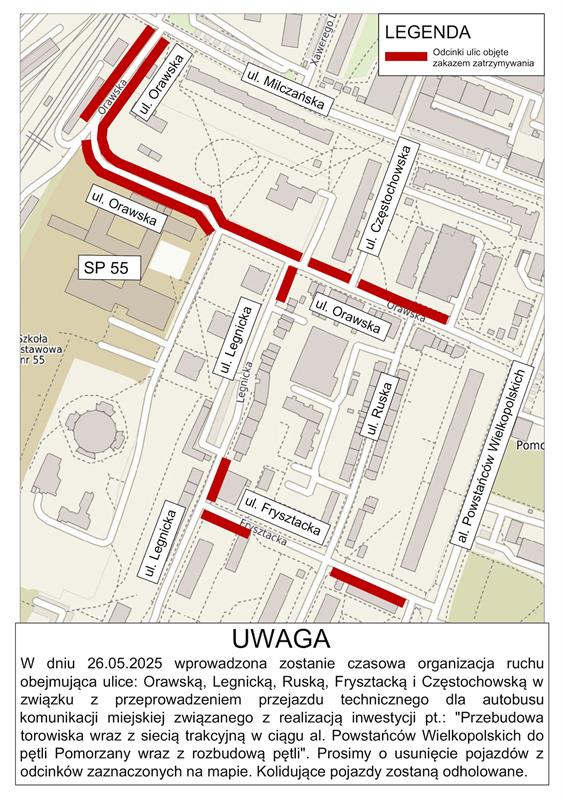 W poniedziałek, 26 maja, po porannym szczycie komunikacyjnym, odbędą się przejazdy próbne autobusów miejskich ulicami Orawską, Legnicką, Frysztacką, Częstochowską i Ruską. Ich celem jest sprawdzenie możliwości organizacji ruchu zastępczego w związku z kolejnym etapem przebudowy torowiska tramwajowego w al. Powstańców Wielkopolskich.