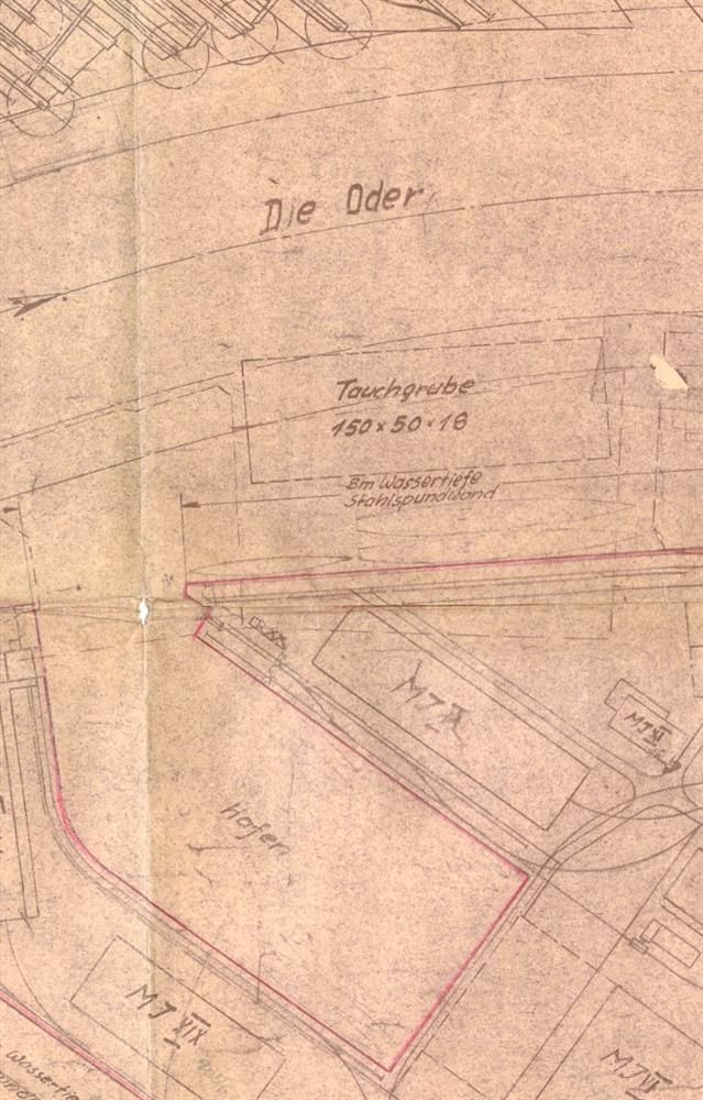 – W czasie inwentaryzacji bunkra natknęliśmy się na dokumentację poniemiecką i znaleźliśmy różne ciekawe rzeczy, między innymi mapę stoczni ze stycznia 1941 roku – mówi Artur Trzeciakowski, dyrektor naczelny MSR „Gryfia”. – Co ciekawe, na tej mapie zaznaczona jest i opisana głębia dla u-bootów, mająca ponad 100 metrów długości, 50 metrów szerokości i 18 metrów głębokości. Nigdzie wcześniej nie widziałem takiego dokumentu. Na mapie widać nawet narysowane przy nabrzeżu sylwetki okrętów i mniejszych jednostek, które przypominają u-booty. Głębia do zanurzeń u-bootów znajdowała się pomiędzy wyspą Gryfia a Stocznią Szczecińską, czyli na tzw. Odrze międzystoczniowej.