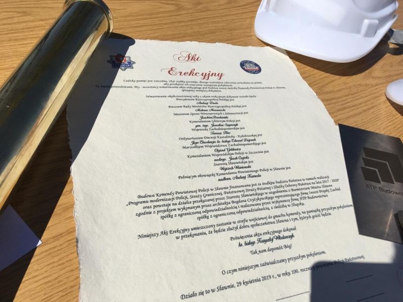 Uroczyste podpisanie aktu erekcyjnego odbyło się w poniedziałek (29 kwietnia) na placu budowy przy ulicy Polanowskiej. Wraz z aktem, dla upamiętnienia wydarzenia, do specjalnej tuby wmurowanej w podwaliny nowej komendy trafiły m.in.: pamiątkowa moneta NBP, okolicznościowy pin z logo powiatu świdwińskiego, grupowe zdjęcie policjantów wraz z aktualnym wykazem funkcjonariuszy i pracowników jednostki. W uroczystości wzięli udział minister spraw wewnętrznych i administracji Joachim Brudziński, sekretarz stanu w MSWiA Paweł Szefernaker, poseł Małgorzata Golińska - sekretarz stanu w Ministerstwie Środowiska, I zastępca komendanta głównego policji nadinsp. Dariusz Augustyniak, wojewoda zachodniopomorski Tomasz Hinc, szef zachodniopomorskich policjantów nadinsp. Jacek Cegieła i komendant powiatowy policji w Sławnie nadkom. Andrzej Kamoda, starosta sławieński Wojciech Wiśniowski.