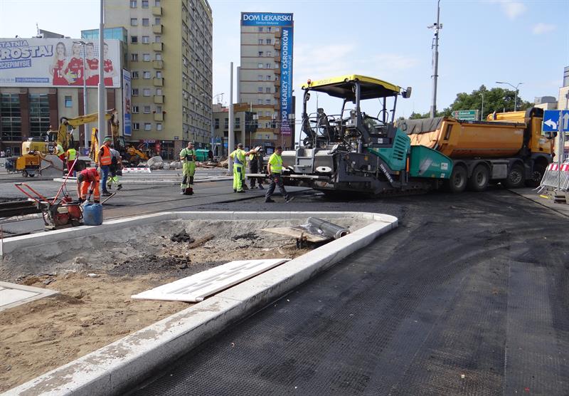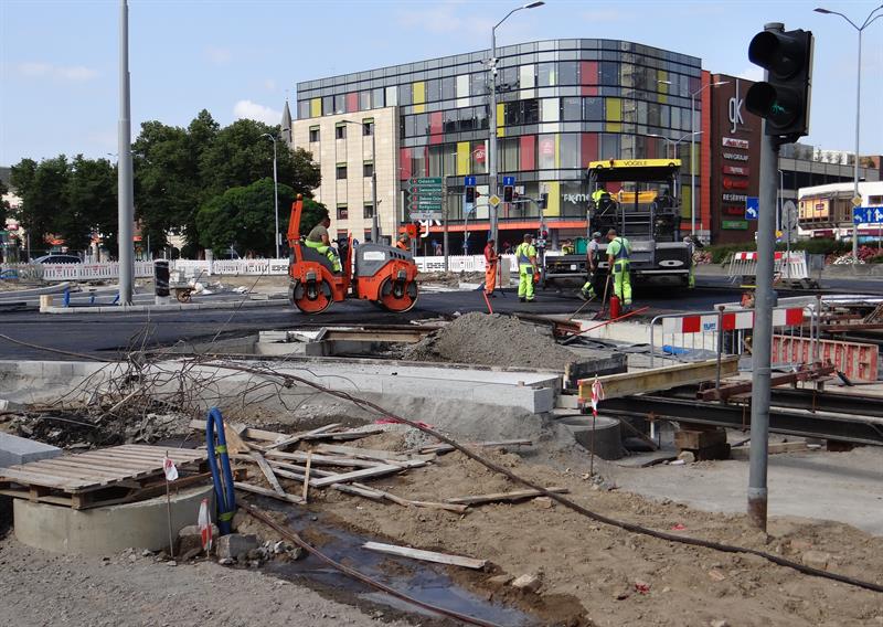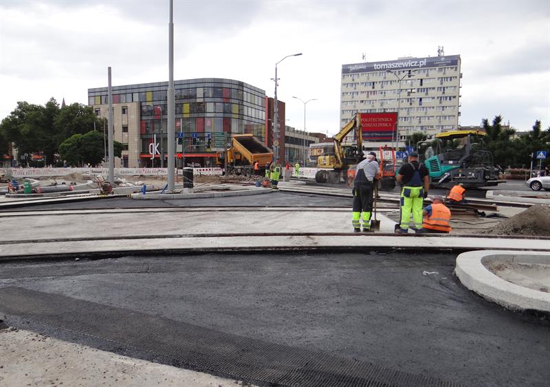Dalej na wlocie w al. Wyzwolenia z pasa prawego możliwy będzie tylko skręt w prawo, a ze środkowego pasa jazda dalej na wprost lub w lewo. Przez kilka ostatnich dni wylewany był tam asfalt w pasie jezdni i międzytorzach na samym przejeździe przez gotowy już fragment nowego torowiska.