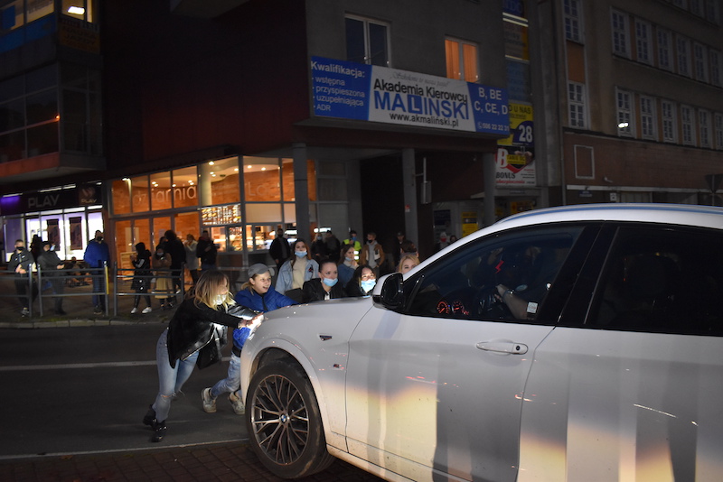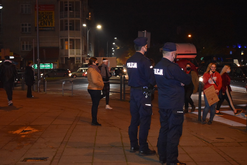 Protestujące panie, mężczyźni, a nawet matki z dziećmi przechadzali się przez przejścia dla pieszych w centrum Stargardu blokując ruch. Co pewien czas tłum kobiet przepuszczał samochody. Klaksony rozbrzmiewały dziś w całym centrum. Część pań w samochodach ustawiła się w pobliżu ronda, blokując je i trąbiąc. Nie obyło się bez, śpieszących się do domu, spięć z przechodniami, a także z kierowcami, którzy chcieli przejechać. Jeden z nich próbował w sposób niezgodny z przepisami wyjechać przez pasy, ale został zablokowany. Młode kobiety rzuciły się na maskę jego BMW. Interweniowała policja, która licznie obstawiała dziś okolice placu Wolności. To kolejny dzień protestów mieszkanek Stargardu. W piątek przemaszerowały z Rynku Staromiejskiego pod budynek biura poselskiego PiS, w sobotę jeździły po rondzie, nie szczędząc klaksonów.