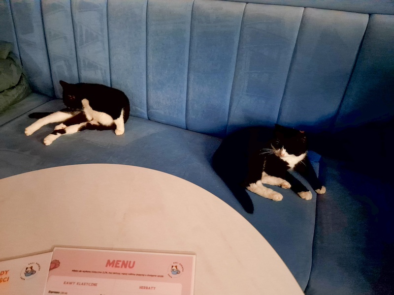 Kociaki bawią się między sobą lub z klientami, odpoczywają, przechadzają między stolikami - jednym słowem żyją na własnych zasadach. Bo to dla nich głównie stworzono to miejsce, które jest swego rodzaju domem tymczasowym. Koty pochodzą z różnych organizacji zajmujących się pomocą zwierzętom. Jak mówi właścicielka kawiarni, są one także przeznaczone do adopcji.