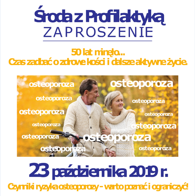 „Środa z profilaktyką” rozpocznie się o godz. 10. W sali konferencyjnej zainteresowani będą się mogli spotkać ze specjalistami: od nauk o zdrowiu (powie o sposobach zapobiegania chorobie i znaczeniu ruchu w profilaktyce osteoporozy), fizjoterapeutą (przedstawi proste ćwiczenia wzmacniające kości) i dietetykiem – przedstawi dietę optymalną w profilaktyce osteoporozy.