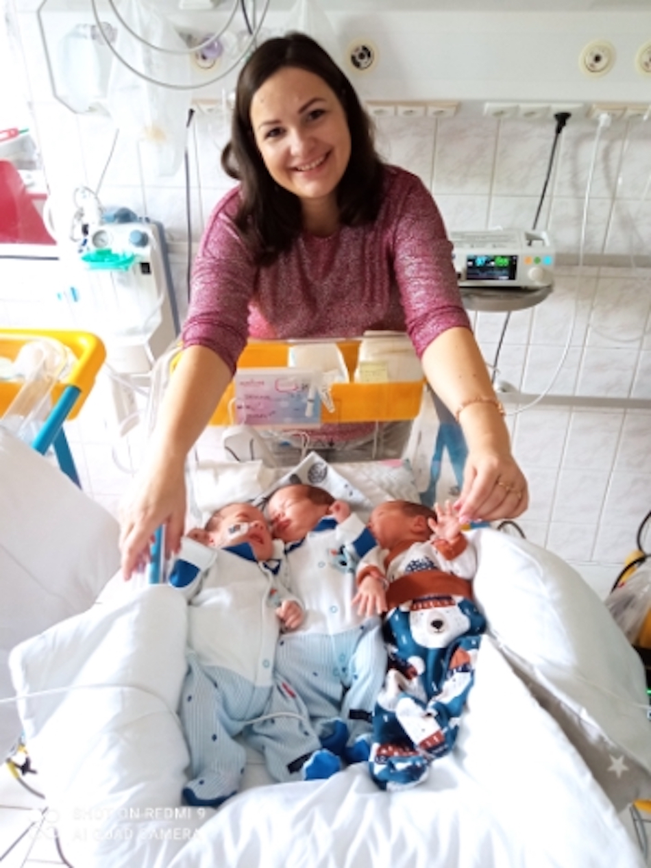 - Pani Oksana ciążę przechodziła bardzo dobrze, ale nagle pojawiły się skurcze i trzeba było przedwcześnie ją rozwiązać - opisuje B. Bartkiewicz. - „Profesor” Daniel urodził się pierwszy, ważył 1200 g, potem wyjęto „spokojnego” Dawida (1100 g) i „niuniusia” Denisa (1130 g). Wszyscy chłopcy byli w stanie średnim i wymagali nieinwazyjnego wsparcia oddechowego. Niestety powodu perforacji przewodu pokarmowego jeden z chłopców wymagał operacji chirurgicznej. Zabieg się udał i mały pacjent powoli zaczął wracać do zdrowia. Obecnie cała trojka jest w dobrym stanie, je samodzielnie z butelki i ładnie przybiera na wadze – wszyscy ważą ponad 2 kilogramy.