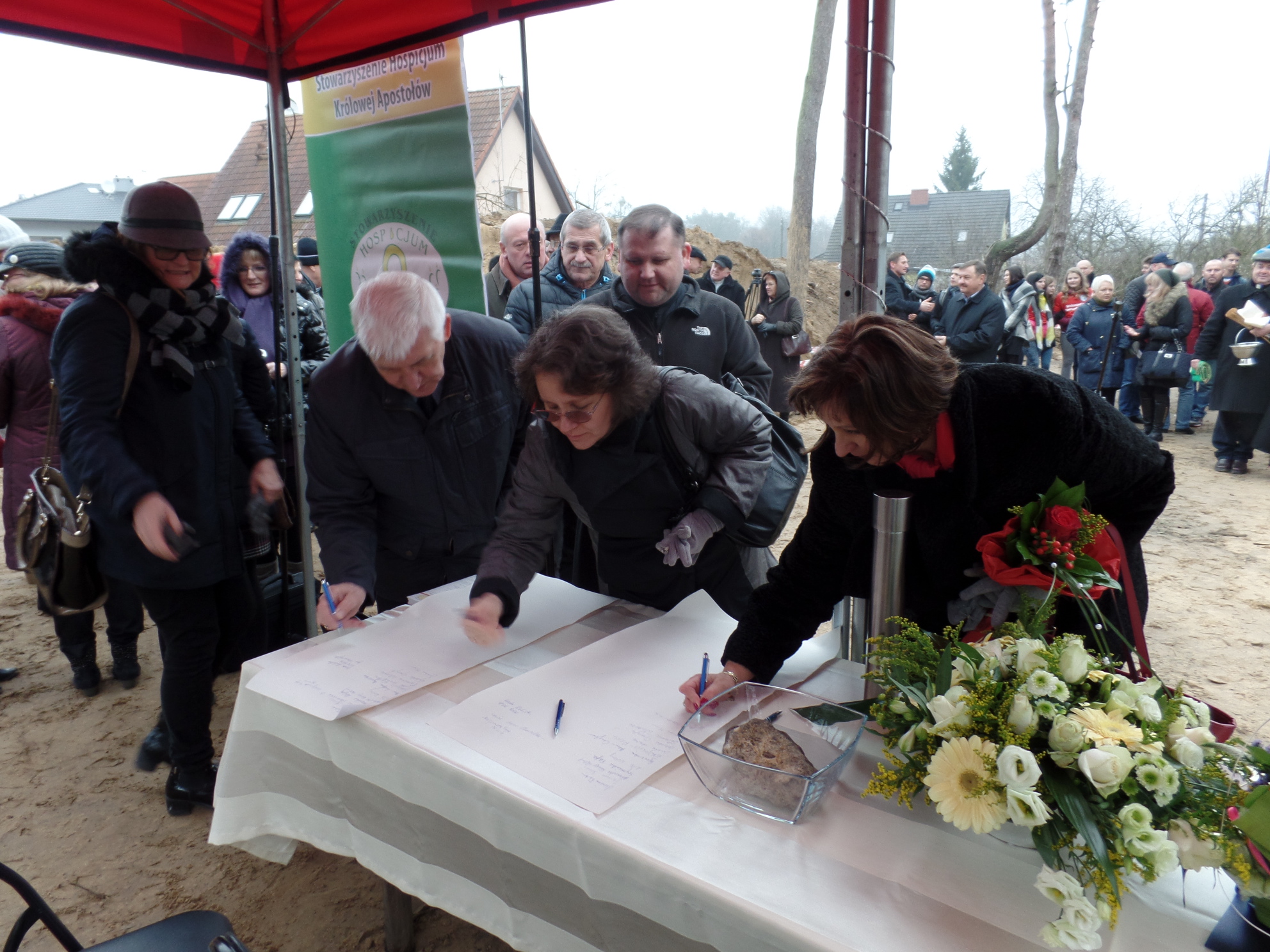 Na zdjęciu: Pod aktem erekcyjnym swoje podpisy złożyli wszyscy goście zaproszeni uroczyste wmurowanie kamienia węgielnego pod budowę hospicjum stacjonarnego w Tanowie.