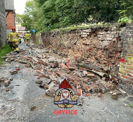 W uprzątnięciu miejsca zdarzenia i zabezpieczaniu uszkodzonego muru udział biorą zastępy Ochotniczej Straży Pożarnej oraz Wojskowej Straży Pożarnej z Trzebiatowa.