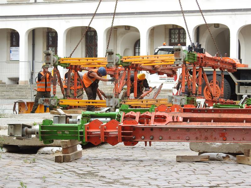 Wieże systemowe i belki konstrukcyjne zamontowano w zamku po ubiegłorocznej katastrofie budowlanej. Doszło do niej 11 maja 2017 r., kiedy filar z drugiego piętra osunął się na niższą kondygnację, która z kolei wcisnęła do piwnicy znajdujący się pod nią słup. W efekcie zrujnowane zostały pomieszczenia, w których działał Teatr Piwnica przy Krypcie, szatnia, sanitariaty i kasa na parterze, sala Elżbietańska na piętrze i znajdująca się nad nią sala Eryka Pomorskiego.