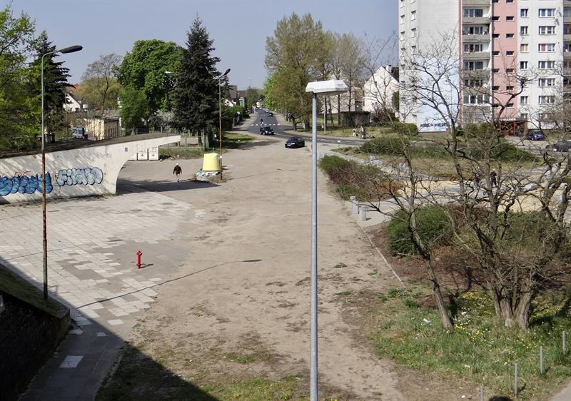 Pomiędzy terenem przylegającym do stacji PKP Szczecin-Zdroje, tuż przy wiadukcie kolejowym i skarpie nasypu ze schodami, które do niej prowadzą, a pasem urządzonego skweru i chodnikiem znajduje się niezagospodarowany teren, wykorzystywany przez kierowców jako parking dla samochodów. Plac ma nawierzchnię częściowo utwardzoną z płyt betonowych, a częściowo to nawierzchnia z piasku i gruzu, którym doraźnie zasypywane bywały w niej kolejne doły i wyrwy.