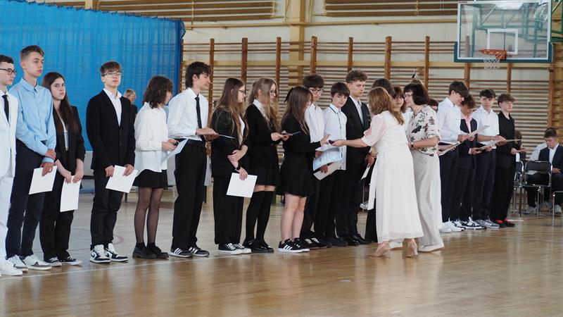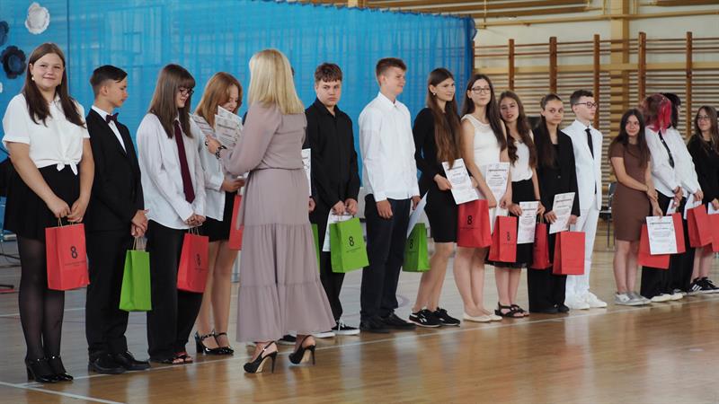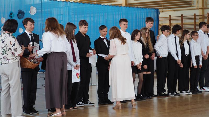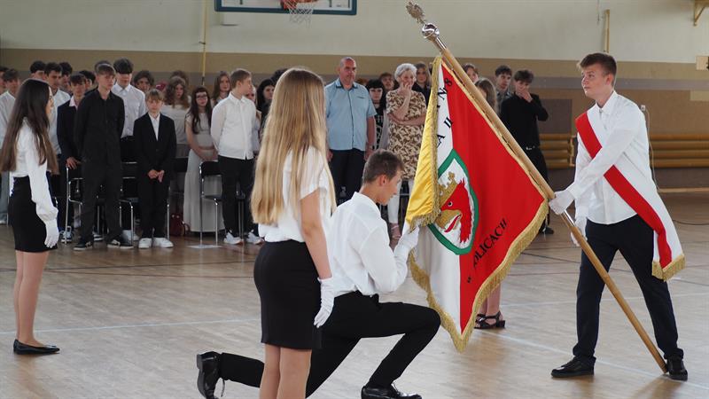 Absolwenci złożyli ślubowanie. Przyrzekli zdobytą wiedzę i umiejętności jak najlepiej wykorzystywać w swoim życiu, sumiennie i uczciwie pracować, aktywnie uczestniczyć w życiu kraju oraz godnie nosić zaszczytne miano wychowanka tej szkoły. Następnie przekazali sztandar szkoły młodszym kolegom z klas siódmych, którzy w przyszłym roku staną się najstarszym rocznikiem.