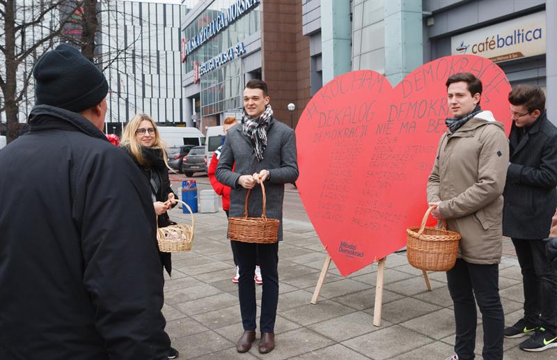 "Kocham demokrację" - pod takim hasłem w walentynki Młodzi Demokraci, młodzieżówka Platformy Obywatelskiej, zorganizowali happening na placu Rodła w Szczecinie. Według nich demokracja jest w naszym kraju zagrożona.
