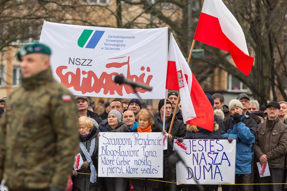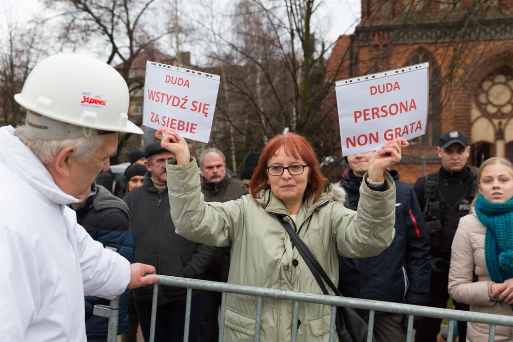 Nieliczne, niestety, grono szczecinian, które śledziło na żywo obchody 45. rocznicy Grudnia '70 było podzielone na przynajmniej dwa obozy. Na dowód dwa transparenty wprost skierowane do prezydenta Andrzeja Dudy. Jeden zdecydowanie przeciwników, drugi raczej zwolenników, choć jego treść nieco zaskakuje.