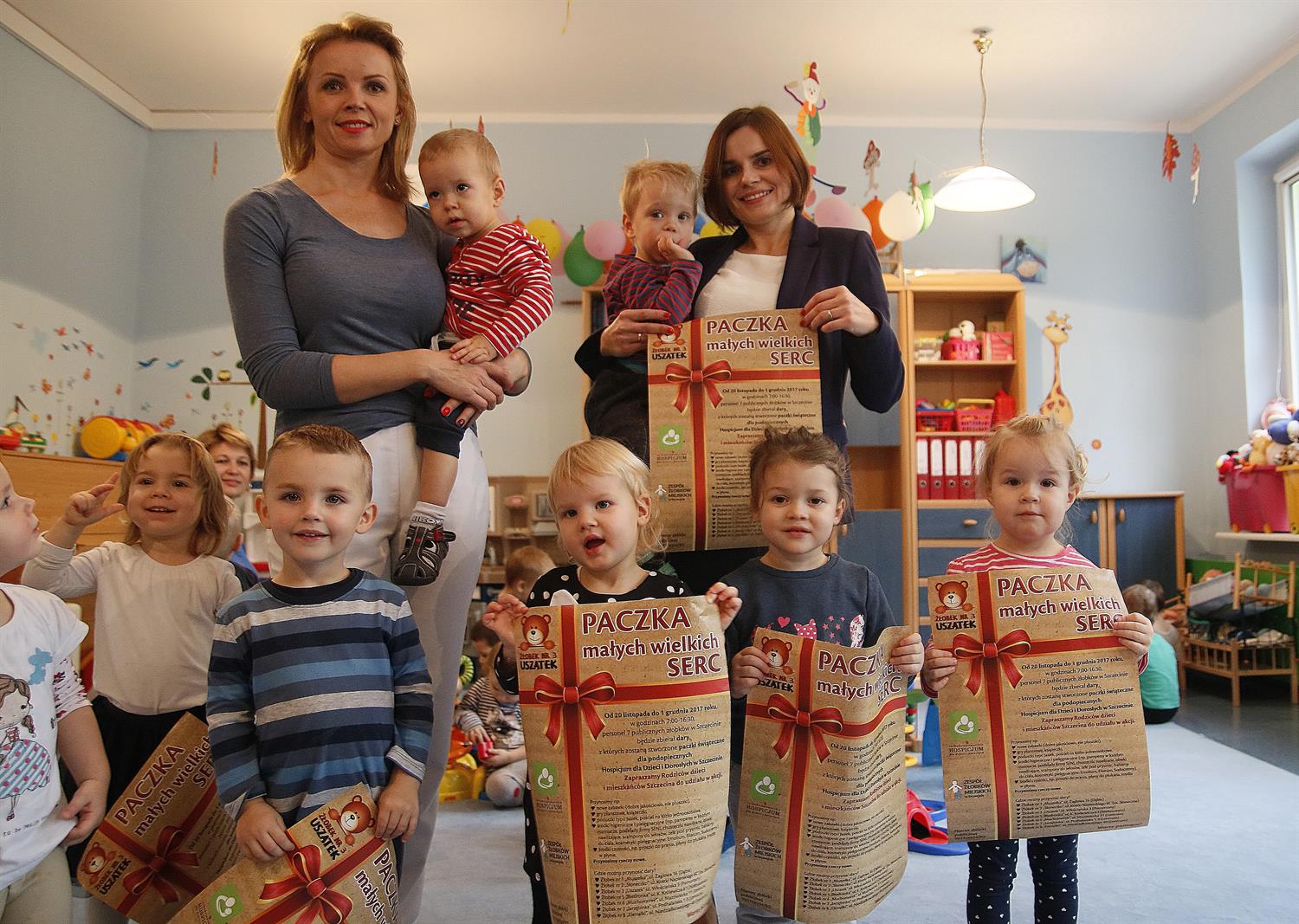 Na zdjęciu (od lewej): W pierwszym rzędzie: Kornelia Bochnak (l. 2,5), Szymon Krzewicki (l. 2,5), Marika Drozdowska (l. 2), Hania Kożuchowska (niemal l. 3), Lena Kirko ( prawie l. 3), a w drugim rzędzie: Piotr Frączek (16 m-cy) na rękach Moniki Petryszyn oraz Aleks Lesiuk (22 m-ce) na rękach dyr. Agnieszki Łaskarzewskiej, pomysłodawczyni „Paczki małych wielkich Serc".