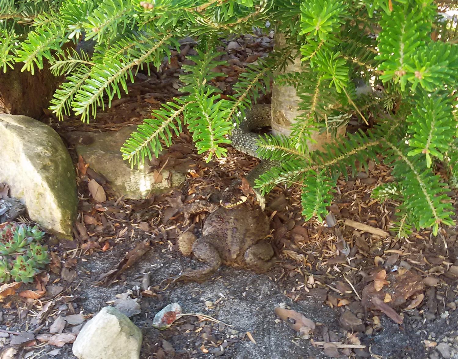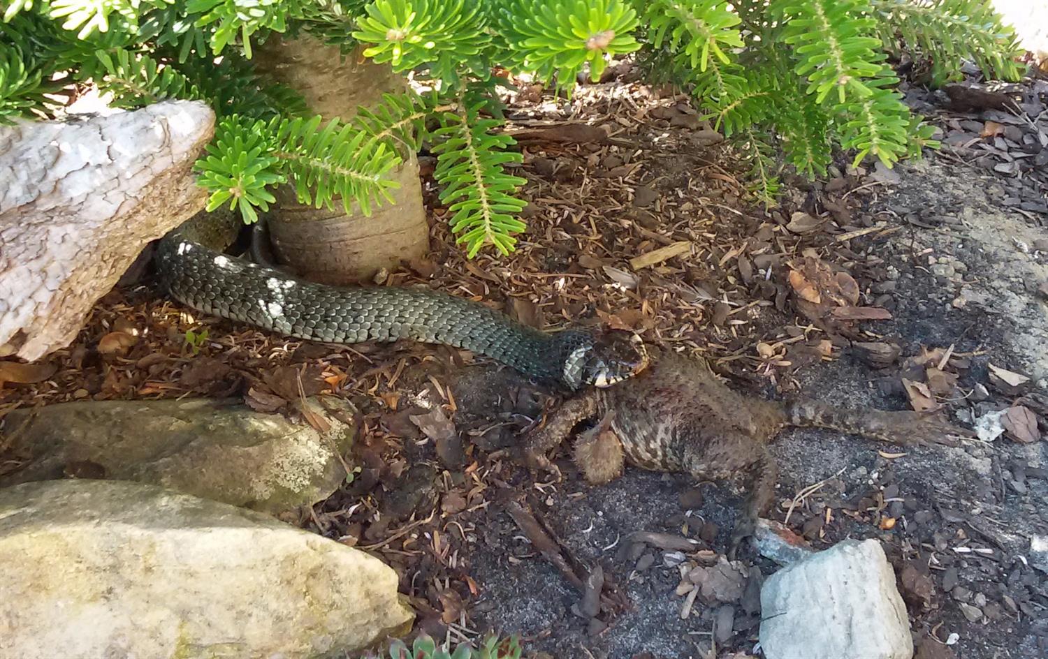 Na zdjęciu: Wąż trzyma w szeroko rozwartych szczękach ogromną ropuchę.