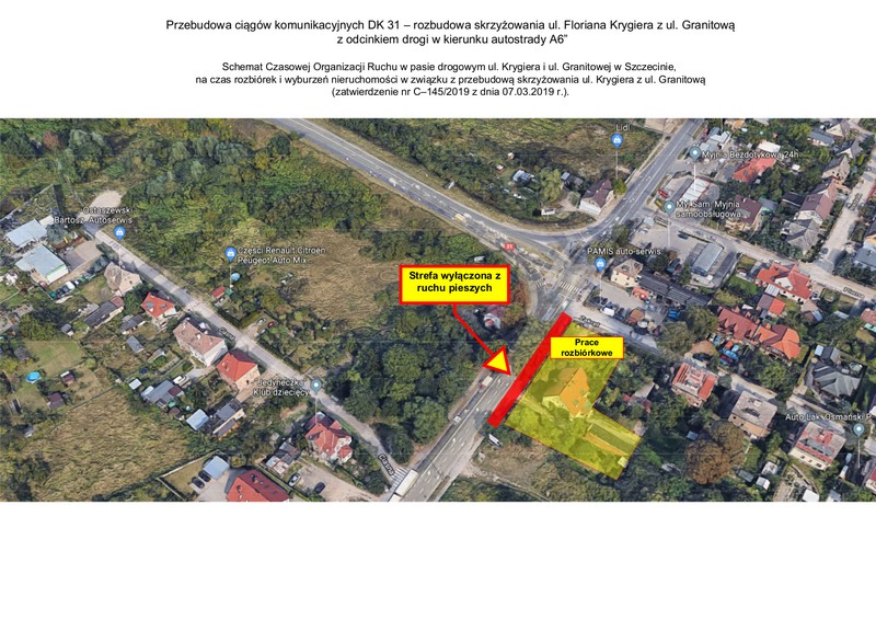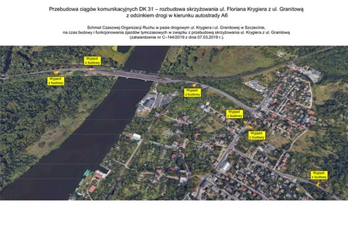 Wjazdy i wyjazdy z budowy będą się znajdować na ulicach Floriana Krygiera, Granitowej i Radosnej. Odcinek chodnika przy ul. Granitowej (po prawej stronie jadąc w kierunku ronda Ułanów Podolskich w Zdrojach) na wysokości ulic Zakręt i Ciasna, będzie wyłączony z ruchu pieszego.