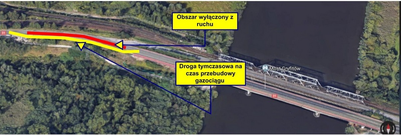 Zmiany - związane z kontynuowaniem prac przy przebudowie gazociągu średniego ciśnienia - zostaną wprowadzone w pasie drogowym ul. Krygiera przed wjazdem na most Gryfitów. Z ruchu wyłączony zostanie fragment ul. Krygiera. Ruch pojazdów będzie się odbywać po przygotowanym bypasie. W obrębie drogi tymczasowej przejezdność zostanie zachowana bez utrudnień w obu kierunkach.