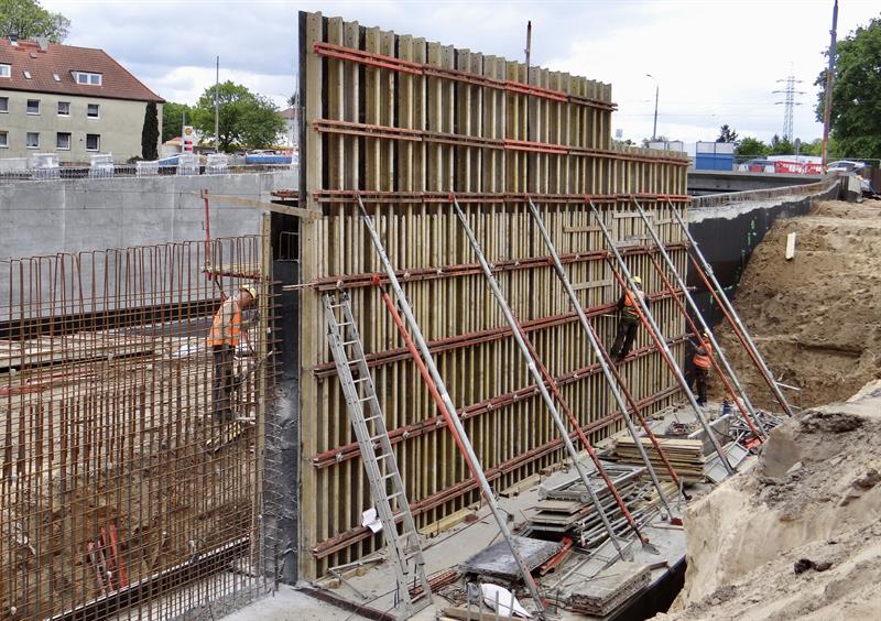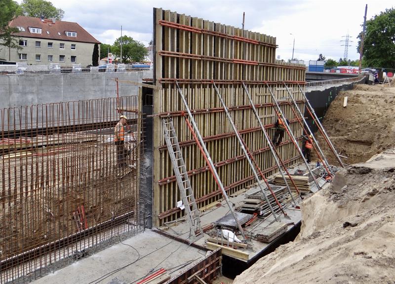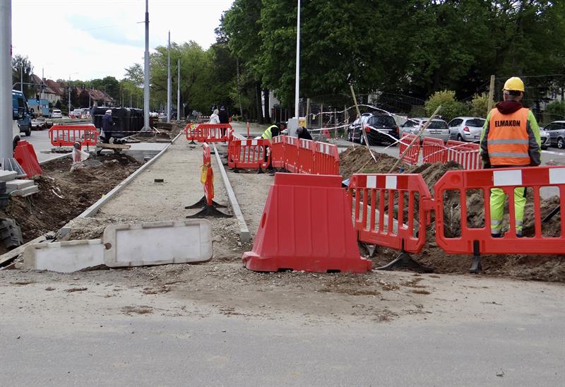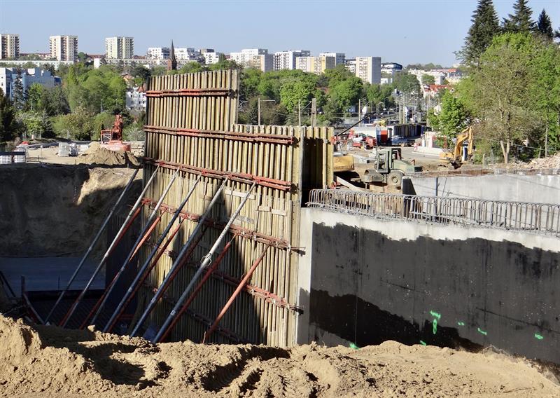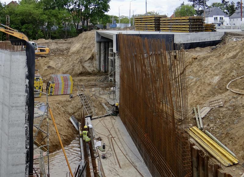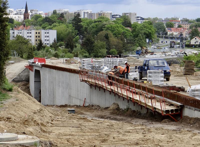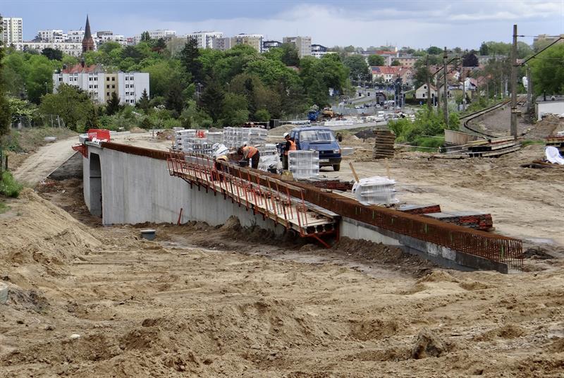 Wytyczanie i usypywanie podbudowy torowiska kolejowego, wykopy i układanie instalacji, brukowanie chodników i dojazdów do budynków, porządkowanie pasów poboczy i obsiewanie ich trawą, montaż stalowych konstrukcji kolejnych fragmentów murów oporowych przy wznoszonych nowych wiaduktach u zbiegu al. Wojska Polskiego z ul. Romualda Traugutta. To tylko część prac przy nowym węźle Łękno z odcinkiem szczecińskiej trasy średnicowej, które – co już wiadomo – będą gotowe później i droższe niż zakładał plan.