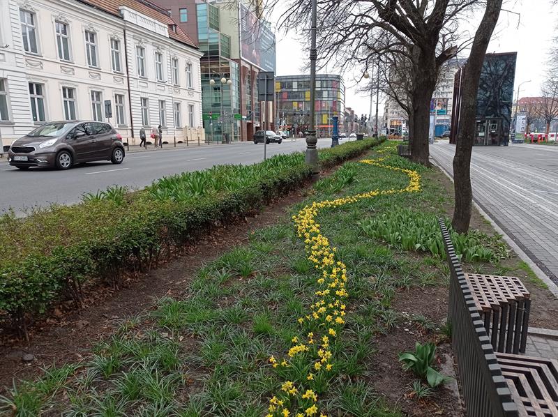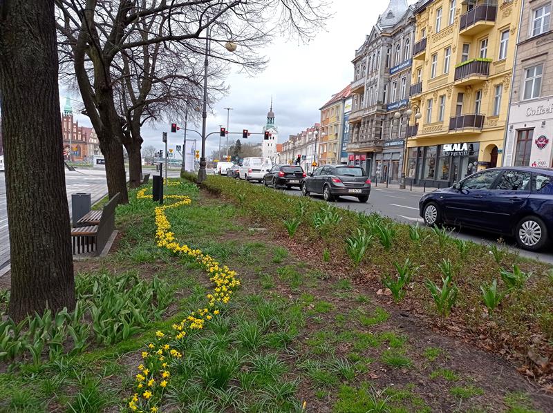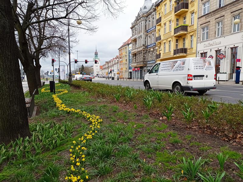 Kto kojarzy nieśmiertelną komedię Tadeusza Chmielewskiego pt. "Nie lubię poniedziałku", ten w dawnej alei kwiatowej z pewnością dostrzeże pewne nawiązanie do filmowego "dzieła" malujących pasy drogowców. Szczególnie teraz, za sprawą żonkili, które - wężykiem - rozkwitły na pasach zielonych deptaku pl. Żołnierza Polskiego.