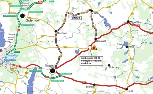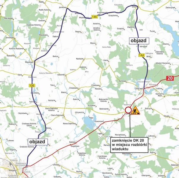 Wykonawca planuje rozbiórkę przęseł w ciągu 3-4 dni. Na czas prowadzenia robót zostanie wprowadzona tymczasowa organizacja ruchu, zakładająca objazd od Chociwla do Dobrej DW 144 i dalej DW146 i DW106 do Maszewa i Stargardu. Skrzyżowania na trasie objazdu będą oznakowane żółtymi tablicami.