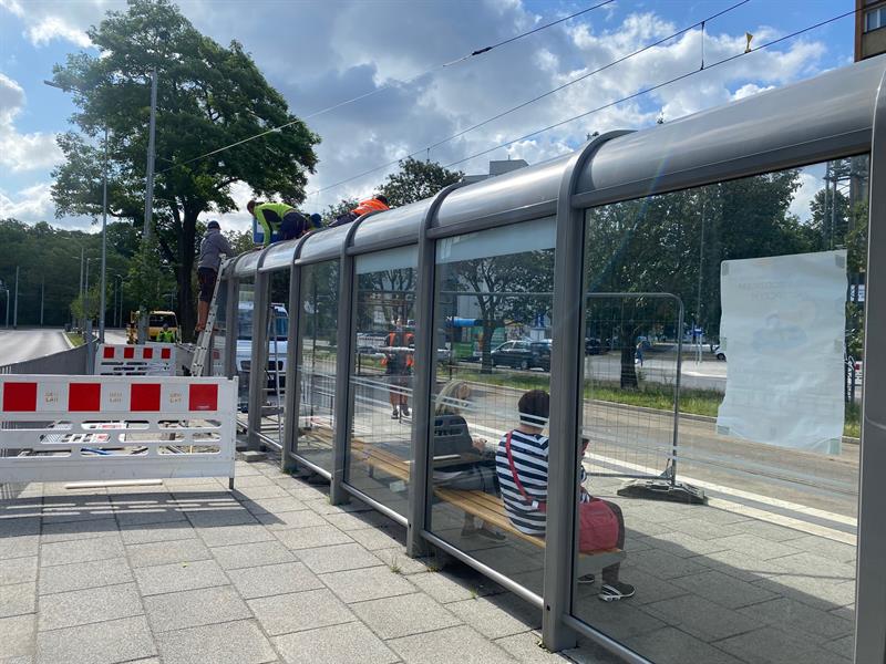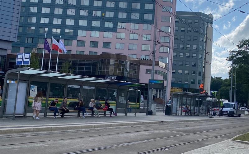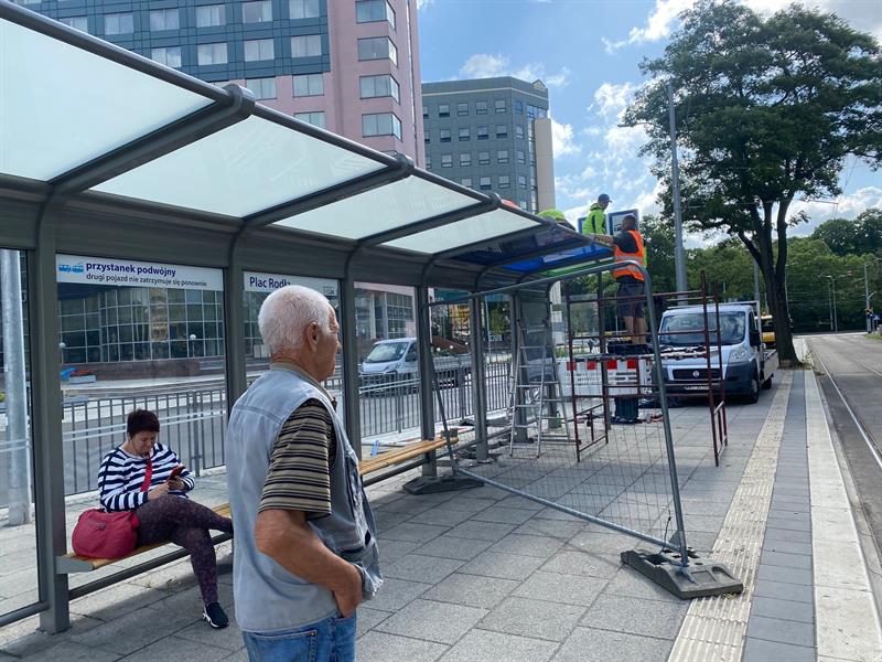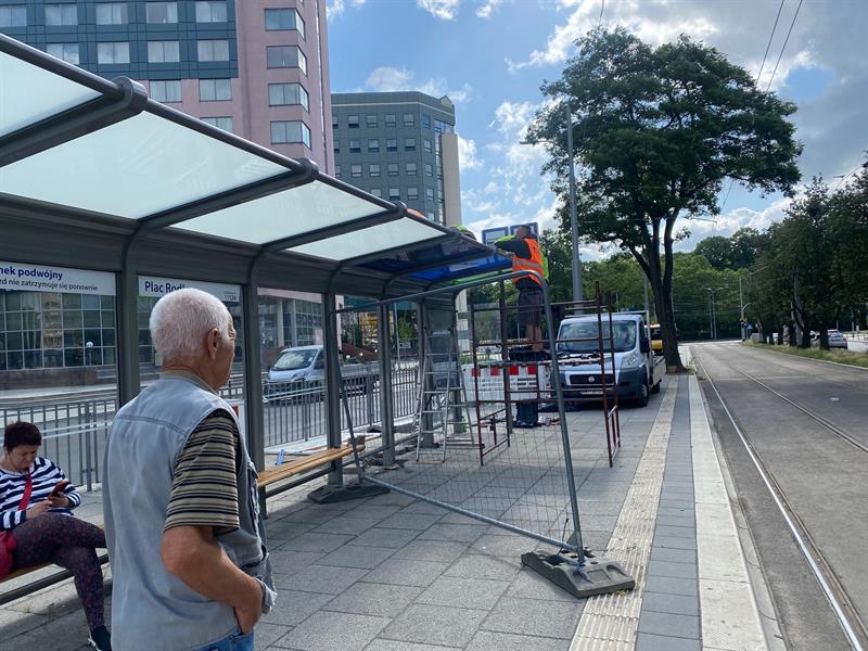 We wtorek 27 czerwca prowadzono prace przy naprawie wiaty na przystanku tramwajowym przy pl. Rodła w Szczecinie. Kilka miesięcy temu, w wielkanocny poniedziałek, uszkodził ją turystyczny autokar, który stoczył się z parkingu pobliskiego hotelu. Na szczęście na przystanku nie było wtedy pasażerów, nikt zatem nie odniósł obrażeń.