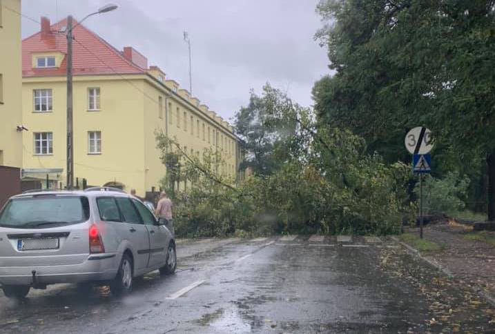 Drzewo przewróciło się także na jezdnie także na ul. Przestrzennej. Tam także były problemy z przejazdem.