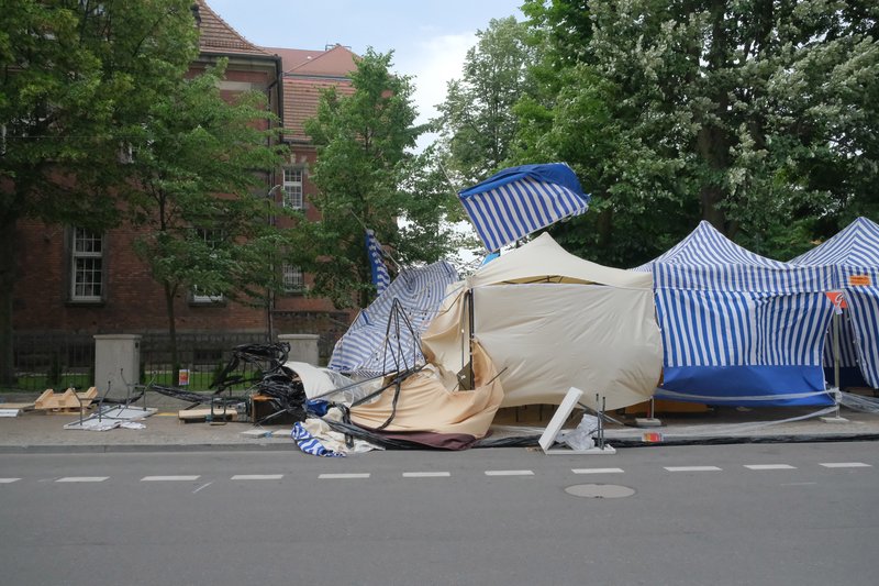 Wiatr połamał też konstrukcje trzech z sześciu namiotów z gastronomią i rękodziełem w Strefie Ekonomii Społecznej, gdzie wystawiają się ZAZ-y Goleniów, Gryfino i Choszczno. Choć stoiska były zabezpieczone, z takim wiatrem nie miały szans.