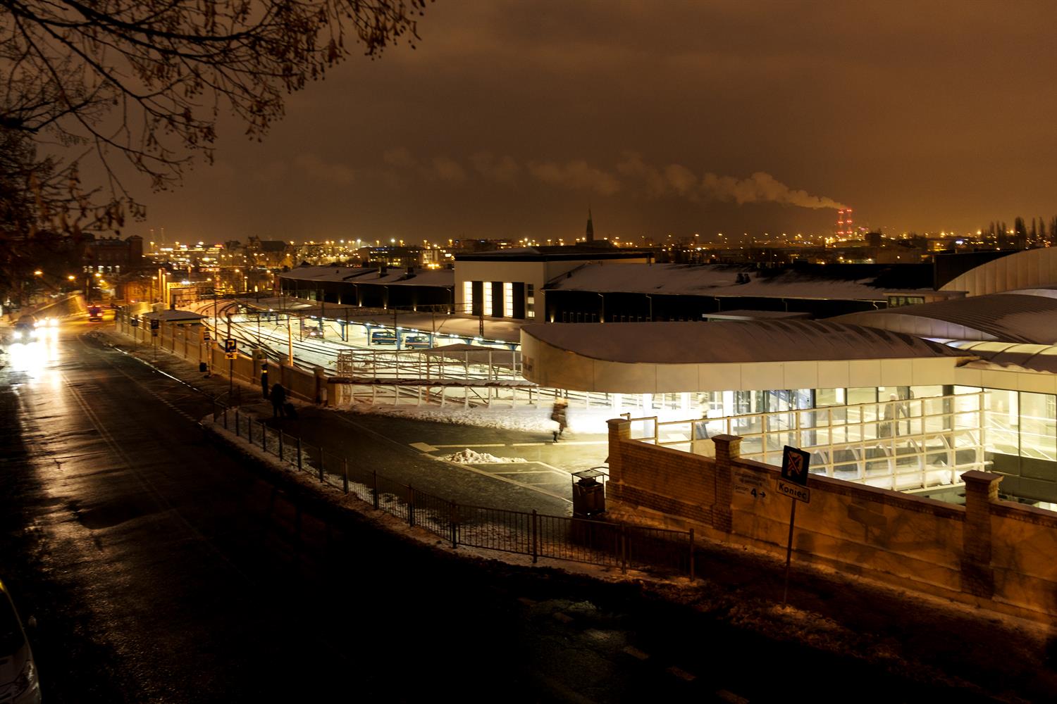 Niestety ładnie, ciepło i jasno jest tylko w środku. Wychodząc z dworca górą, czyli od strony ul. Owocowej, natychmiast wchodzimy w… czarną dziurę. Całkowitą ciemność (najpewniej spotęgowaną jeszcze przez jasność, z której wychodzimy). Ulica jest całkowicie pogrążona mroku. Nie świeci się na niej ani jedna latarnia – zresztą nic dziwnego, tam ich w ogóle nie ma. Żeby odczytać rozkład jazdy na pobliskim przystanku autobusowym, trzeba mieć ze sobą latarkę, która zresztą przyda się w drodze do „miasta”, czyli na ul. 3 Maja lub ul. Nową.
