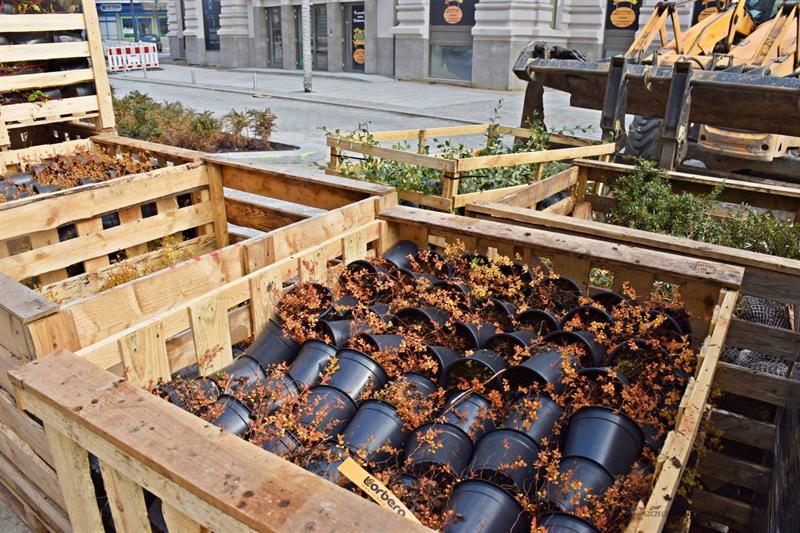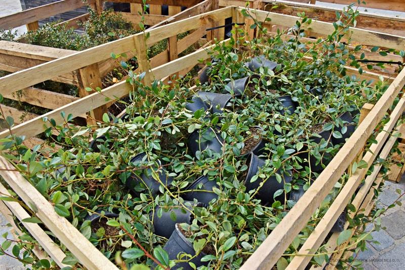 We wtorek przyjechał transport krzewów, których palety zostały wyładowane na placu budowy. Wśród sadzonek znalazły się: Berberys brodawkowaty – 2043 szt.; Berberys Thunberga, w dwóch odmianach – ‚Atropurpurea’ – 1206 szt. i ‚Rose Glow’ – 918 szt.; Dereń biały ‚Sibiraca’ – 308 szt.; Irga Dammera – 462 szt.; Krzewuszka cudowna – 318 szt.; Tawuła brzozolistna „Tor Gold’ – 1306 szt.; Tawuła japońska „Golden Princess’ -1287 szt.; Dereń rozłogowy ‚Flaviramea’ – 64 szt.
