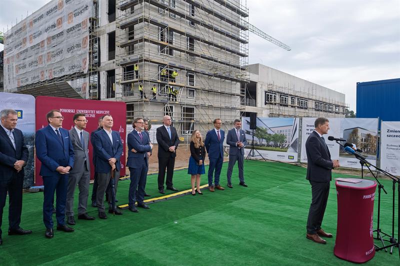 W wydarzeniu wzięli udział przedstawiciele uczelni, Ministerstwa Zdrowia, władz miasta i województwa, a także firm realizujących inwestycję. Wiechę na dach wspólnie wciągnęli rektor Pomorskiego Uniwersytetu Medycznego prof. Leszek Domański oraz Ilona Hibner, dyrektor Departamentu Oceny Inwestycji w Ministerstwie Zdrowia.