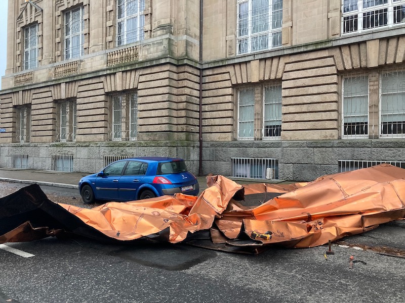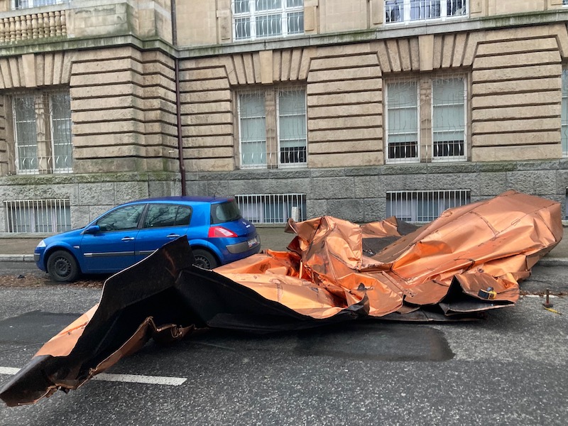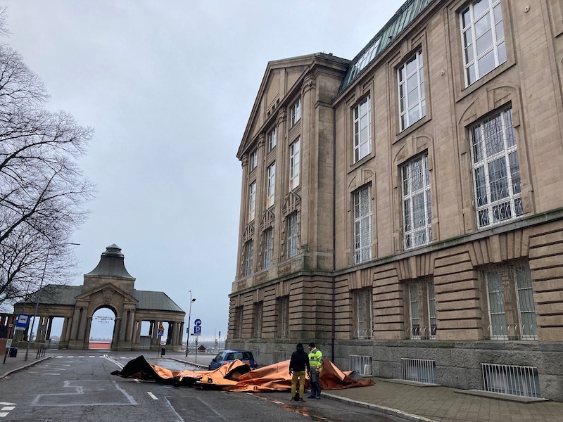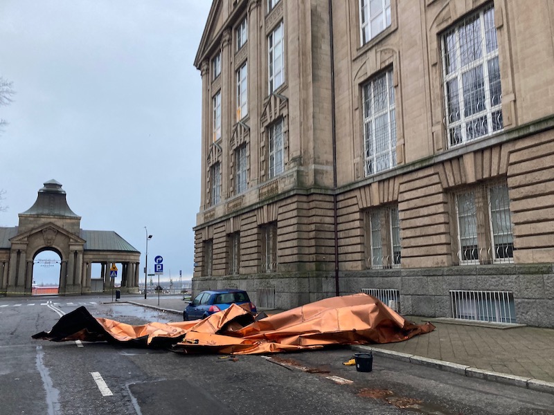 Sporo interwencji jest też w samym Szczecinie. Wśród nich zerwany fragment dachu z gmachu budynku Muzeum Narodowego przy Wałach Chrobrego. Spory fragment blachy spadł tuż obok zaparkowanego samochodu osobowego i blokuje jeden pas ul. Szczerbcowej.