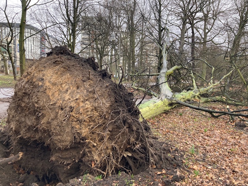 Wiatr łamał drzewa m.in. na ul. Krygiera i Ku Słońcu - w rejonie bramy głównej Cmentarza Centralnego. Wywiał cegły na pasy jezdni przy Teatrze Kana, a kontenerami na odpady zatarasował pas al. Wyzwolenia - pomiędzy biurowcem Oxygen i Hanzą Tower. Niemal na całym odcinku "tramwajowej rewolucji" w tejże alei padło sporo znaków drogowych, a wiatr położył również barierki i rozwiał pachołki oddzielające teren budowy od pasów jezdni.