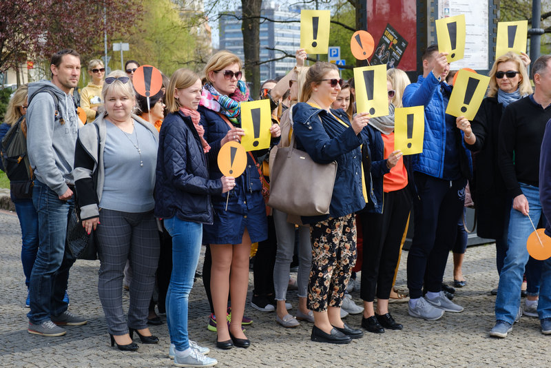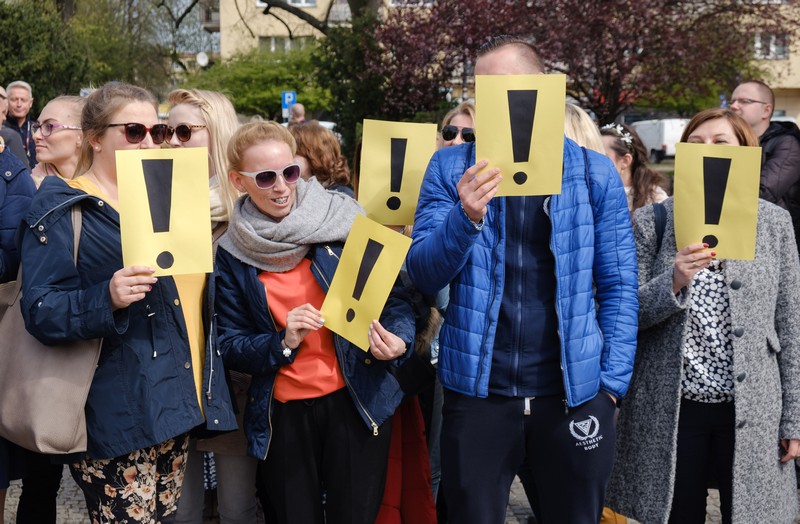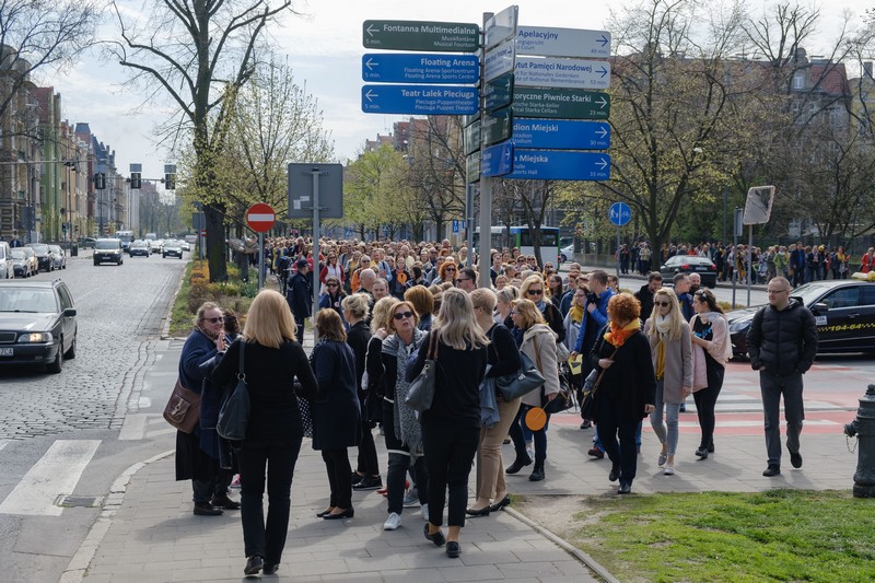 Tłum ludzi zebrał się w środę w południe na placu Grunwaldzkim, aby okazać swoją solidarność ze strajkującymi nauczycielami. Wyróżniali się przypinkami z wykrzyknikiem oraz żółtymi elementami ubioru.