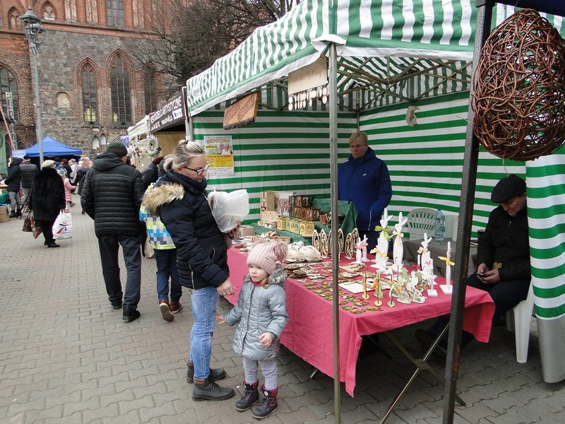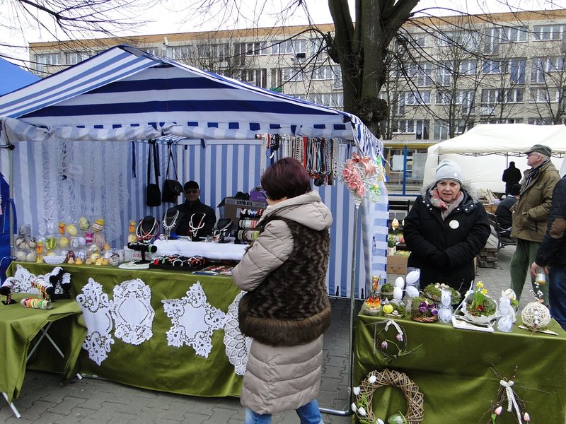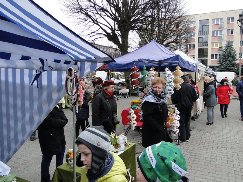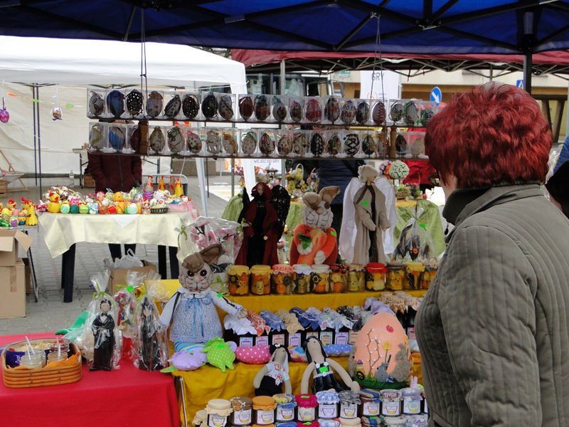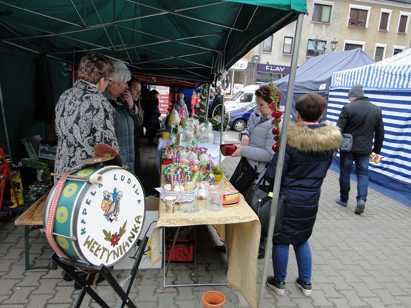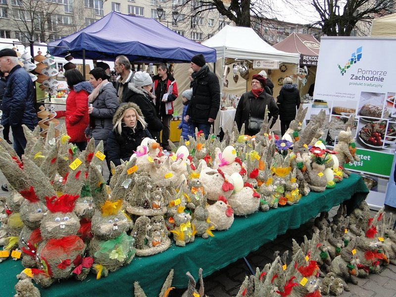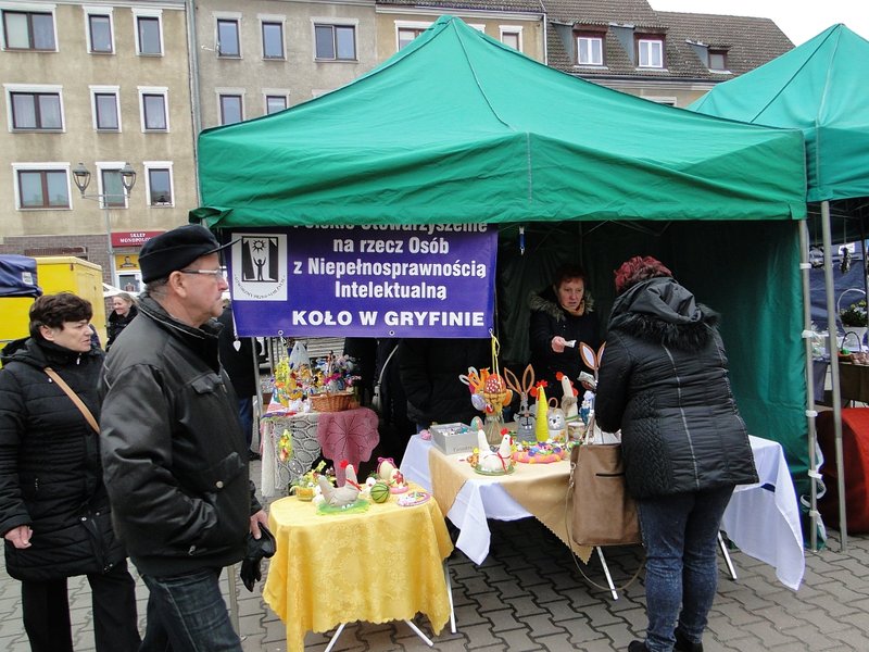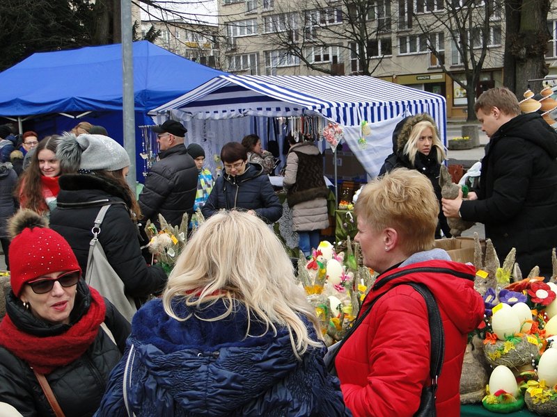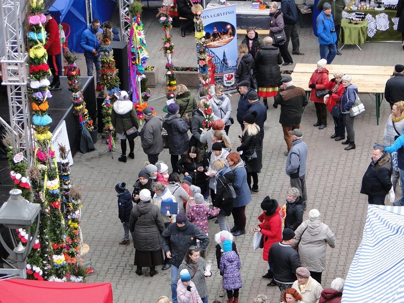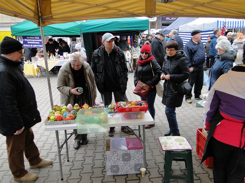 Podczas sobotniego (24 marca) wielkanocnego jarmarku na placu Barnima w Gryfinie chętni mogli kupić m.in. pisanki, kraszanki, stroiki świąteczne, ozdobne serwety i obrusy, palemki, wonne świece, koszyczki, wielkanocne słodkości, miody pitne i inne specjały.