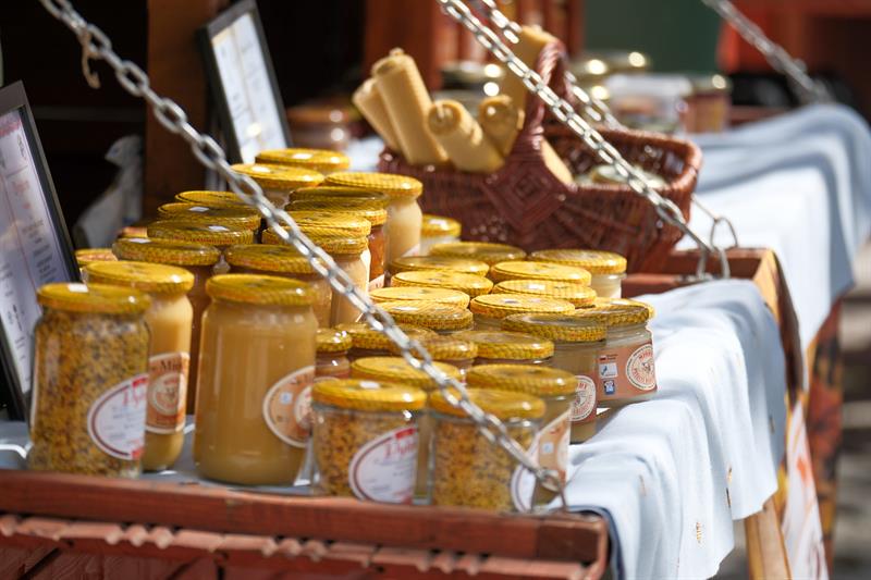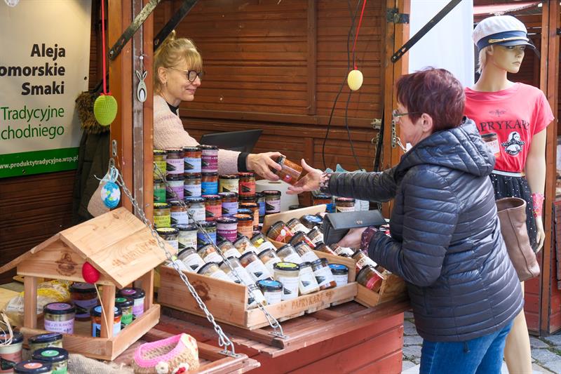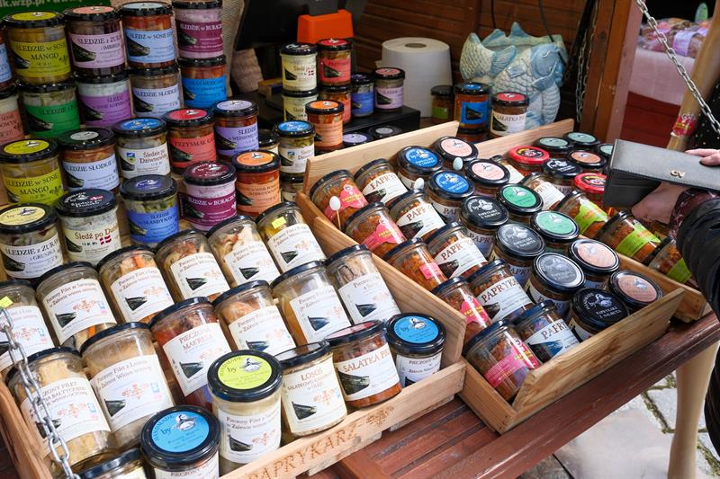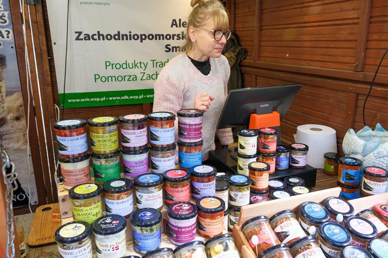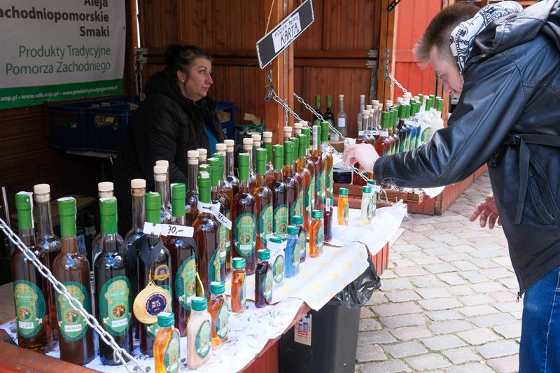 Wśród oferowanych produktów są również przetwory rybne, wina z zachodniopomorskich winnic, miody pitne i regionalne nalewki. Wiele stoisk zdobią kolorowe dekoracje.