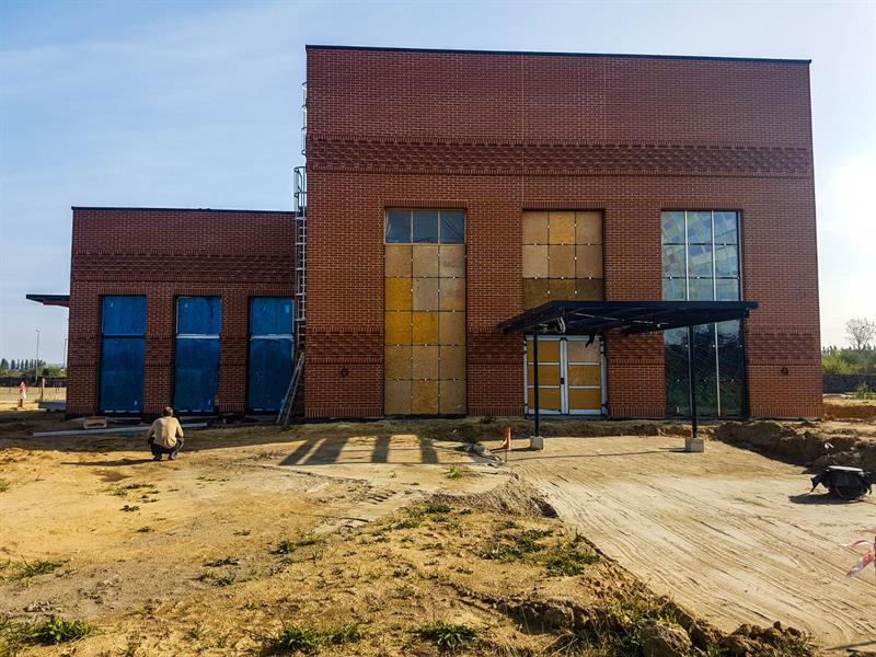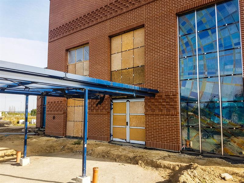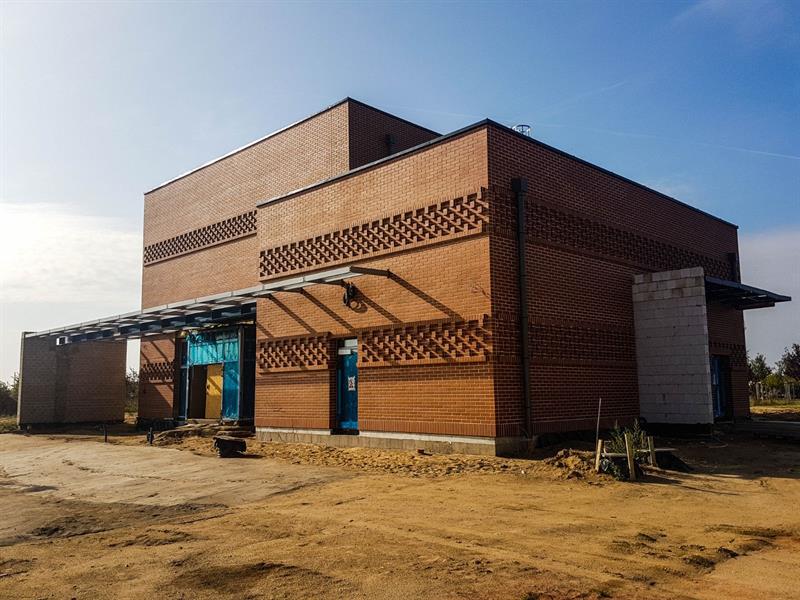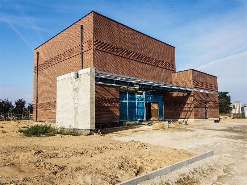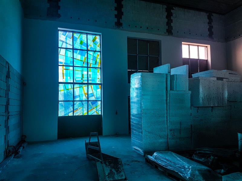 Po blisko 8 miesiącach od przekazaniu placu budowy parterowa bryła o modernistycznym kształcie - zestawienie dwóch prostopadłościanów, których dominantę stanowi przyszła sala ceremonii - jest wreszcie w stanie tzw. surowym otwartym. Właśnie został wstawiony pierwszy z czterech zaplanowanych witraży.