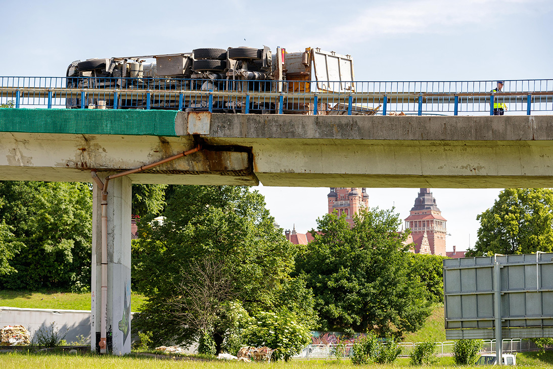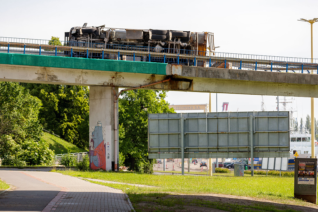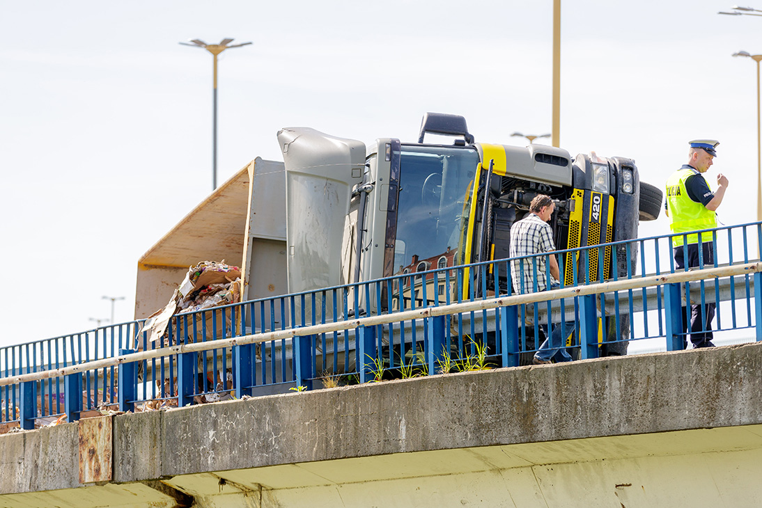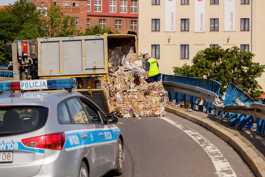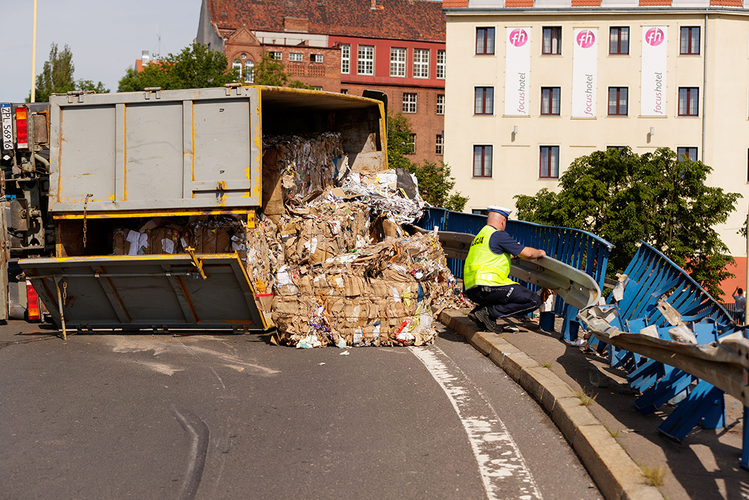 Dopiero ok. godz. 16 udało się przywrócić ruch kołowy od strony Nabrzeża Wieleckiego na Trasę Zamkową. Przypomnijmy, że w piątek (9 czerwca) rano doszło w tym miejscu do wypadku samochodu ciężarowego Skania, który przewoził makulaturę.
